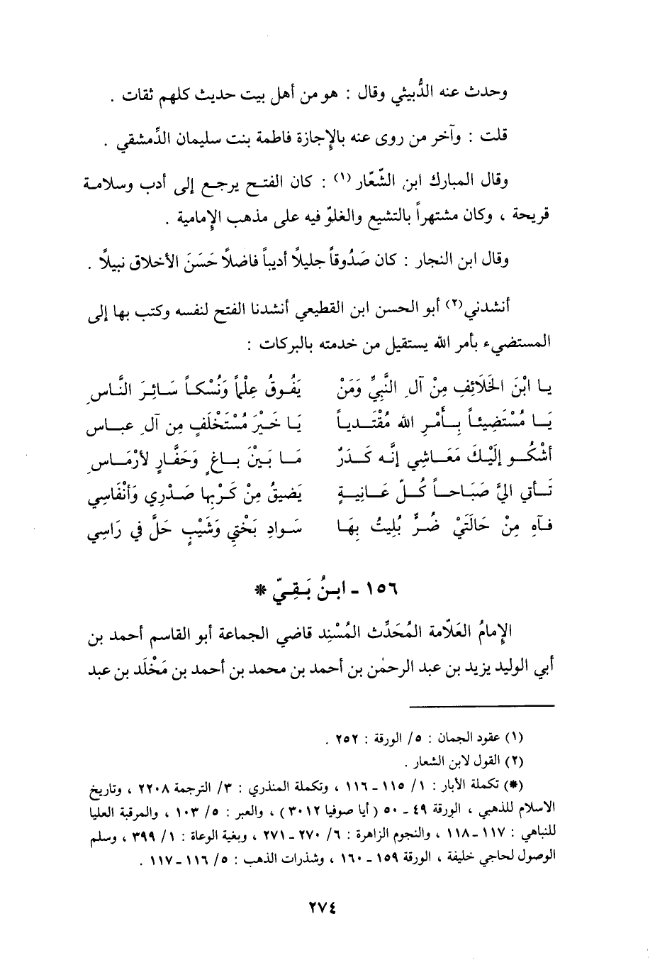 أَنْشَدَنِي (2) أَبُو الحَسَنِ ابْنُ القَطِيْعِيِّ، أَنْشَدَنَا الفَتْحُ لِنَفْسِهِ، وَكَتَبَ بِهَا إِلَى المُسْتَضِيْءِ بِأَمْرِ اللهِ يَسْتَقيلُ مِنْ خِدْمَتِهِ بِالبَرَكَاتِ: