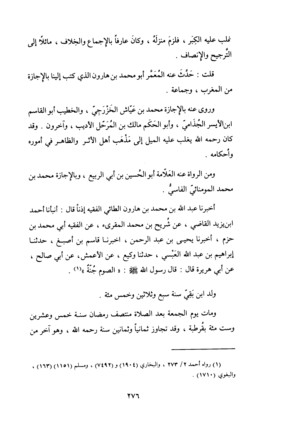 أَخْبَرَنَا عَبْدُ اللهِ بنُ مُحَمَّدِ بنِ هَارُوْنَ الطَّائِيّ الفَقِيْه إِذْناً، قَالَ: أَنْبَأَنَا أَحْمَدُ بنُ يَزِيْدَ القَاضِي، عَنْ شُرَيْحِ بنِ مُحَمَّدٍ المُقْرِئِ، عَنِ الفَقِيْهِ أَبِي مُحَمَّدٍ بنِ حَزْم، أَخْبَرَنَا يَحْيَى بنُ عَبْدِ الرَّحْمَنِ، أَخْبَرَنَا قَاسم بن أَصْبَغَ، حَدَّثَنَا إِبْرَاهِيْمُ بنُ عَبْدِ اللهِ العَبْسِيّ، حَدَّثَنَا وَكِيْعٌ، عَنِ الأَعْمَشِ، عَنْ أَبِي صَالِحٍ، عَنْ أَبِي هُرَيْرَةَ، قَالَ: