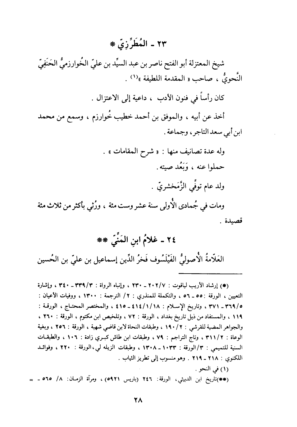 شَيْخُ المُعْتَزِلَةِ، أَبُو الفَتْحِ نَاصِرُ بنُ عَبْدِ السَّيِّدِ بنِ عَلِيٍّ الخُوَارِزْمِيُّ، الحَنَفِيُّ، النَّحْوِيُّ، صَاحِبُ (المُقَدِّمَةِ اللَّطيفَةِ (1)) .