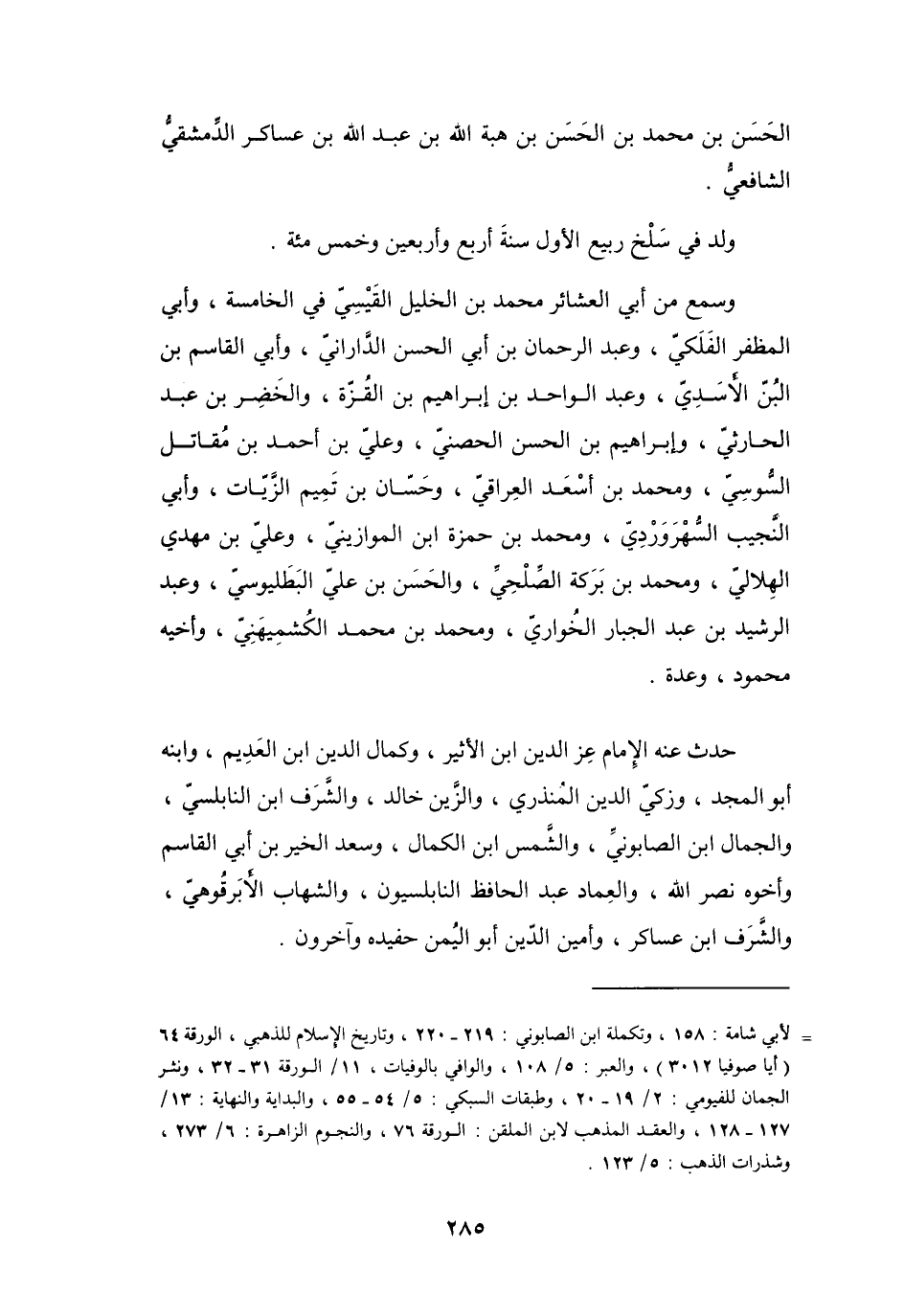 الحَسَنُ بنُ مُحَمَّدِ بنِ الحَسَنِ بنِ هِبَةِ اللهِ بنِ عَبْدِ اللهِ بنِ عَسَاكِرَ الدِّمَشْقِيّ، الشَّافِعِيّ.