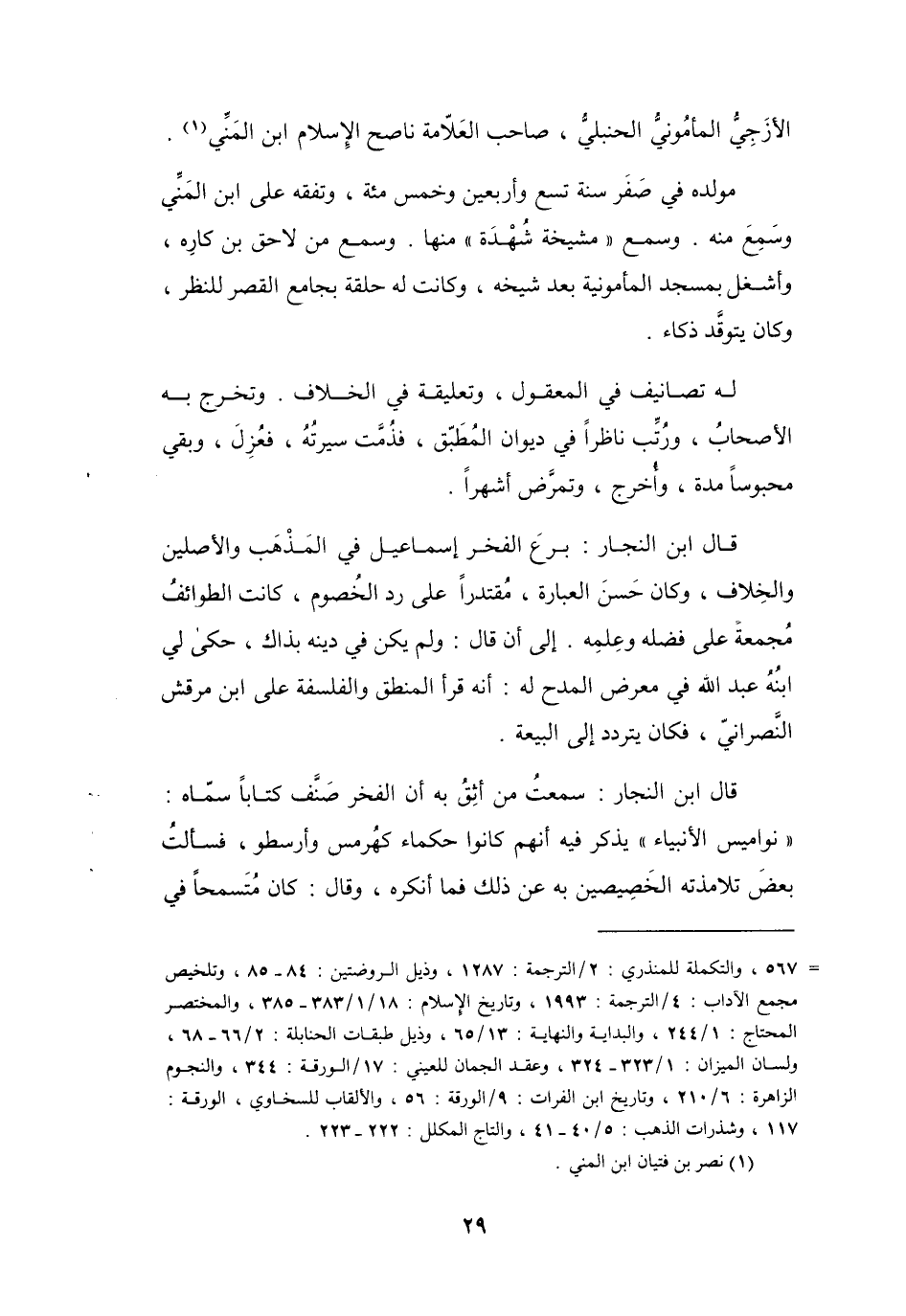 الأَزَجِيُّ، المَأْمُوْنِيُّ، الحَنْبَلِيُّ، صَاحِبُ العَلاَّمَةِ نَاصِحِ الإِسْلاَمِ، ابْن المَنِّيِّ (1) .