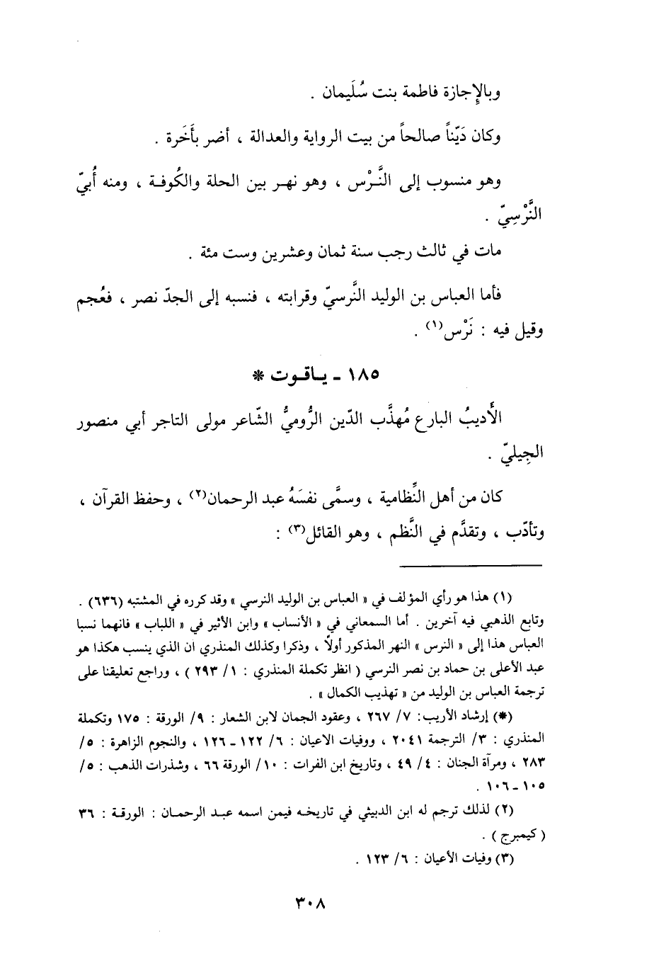 أما السمعاني في " الأنساب " وابن الأثير في " اللباب " فانهما نسبا العباس هذا إلى " النرس " النهر المذكور أولا، وذكرا وكذلك المنذري ان الذي ينسب هكذا هو عبد الأعلى بن حماد بن نصر النرسي (انظر تكملة المنذري: 1 / 293) ، وراجع تعليقنا على ترجمة العباس بن الوليد من " تهذيب الكمال ".