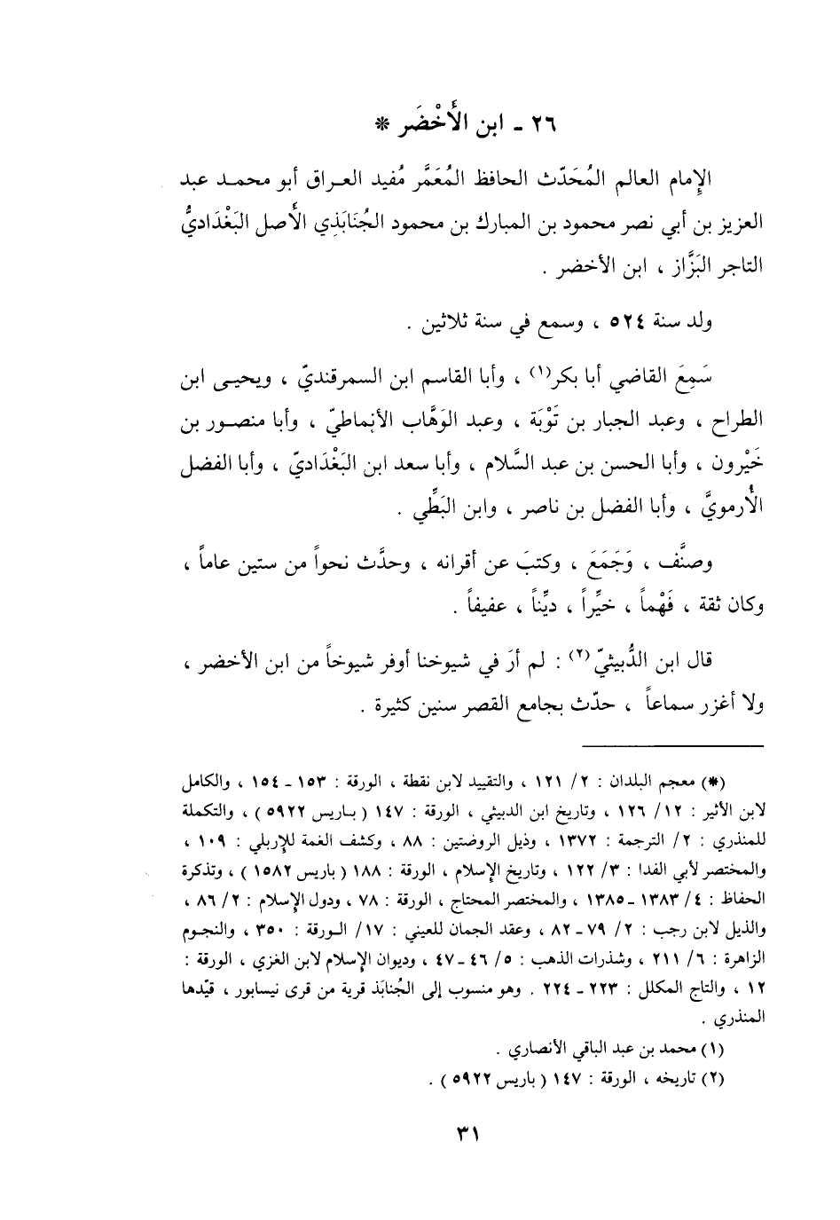 26 - ابْنُ الأَخْضَرِ عَبْدُ العَزِيْزِ بنُ مَحْمُوْدٍ الجُنَابَذِيُّ *