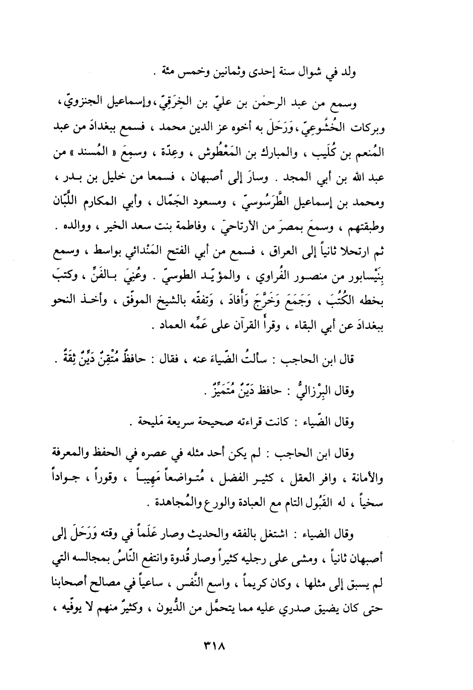 وَقَالَ الضِّيَاءُ: اشْتَغَلَ بِالفِقْهِ وَالحَدِيْثِ، وَصَارَ عَلَماً فِي وَقْتِهِ، وَرَحَلَ إِلَى أَصْبَهَانَ ثَانِياً، وَمَشَى عَلَى رِجْلَيْهِ كَثِيْراً، وَصَارَ قُدْوَةً، وَانتَفَعَ النَّاسُ بِمَجَالِسِهِ الَّتِي لَمْ يُسْبَقْ إِلَى مِثْلِهَا، وَكَانَ كَرِيْماً، وَاسِعَ النَّفْسِ، سَاعِياً فِي مَصَالِحِ أَصْحَابِنَا، حَتَّى كَانَ يَضِيقُ صَدْرِي عَلَيْهِ مِمَّا يَتَحَمَّلُ مِنَ الدُّيُونِ، وَكَثِيْرٌ مِنْهُم لاَ يُوَفِّيهِ ... ،