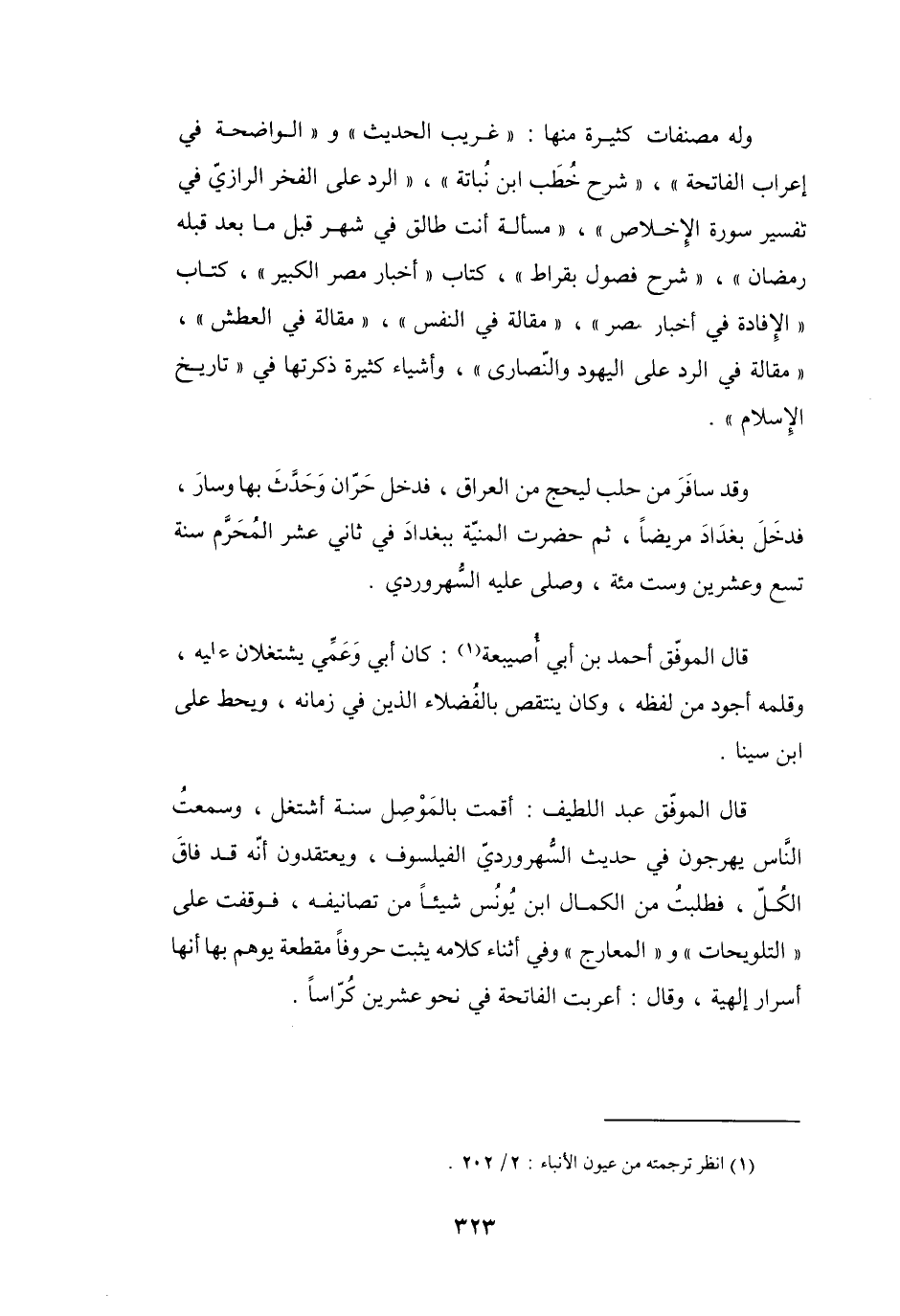 قَالَ المُوَفَّقُ عَبْدُ اللَّطِيْفِ: أَقَمْتُ بِالمَوْصِلِ سَنَةً أَشتغِلُ، وَسَمِعْتُ النَّاسَ يَهرجُوْنَ فِي حَدِيْثِ السُّهْرَوَرْدِيِّ الفَيْلَسُوْفِ، وَيَعْتَقِدُوْنَ أَنَّهُ قَدْ فَاقَ الكُلَّ، فَطَلبتُ مِنَ الكَمَالِ ابْنِ يُوْنُسَ شَيْئاً مِنْ تَصَانِيْفِهِ، فَوَقَفْتُ عَلَى (التَّلْوِيْحَاتِ) ، وَ (المعَارجِ) ، وَفِي أَثْنَاءِ كَلاَمِهِ يُثْبِتُ حُرُوَفاً مُقَطَّعَةً يُوهِمُ بِهَا أَنَّهَا أَسرَارٌ إِلَهِيَّةٌ.