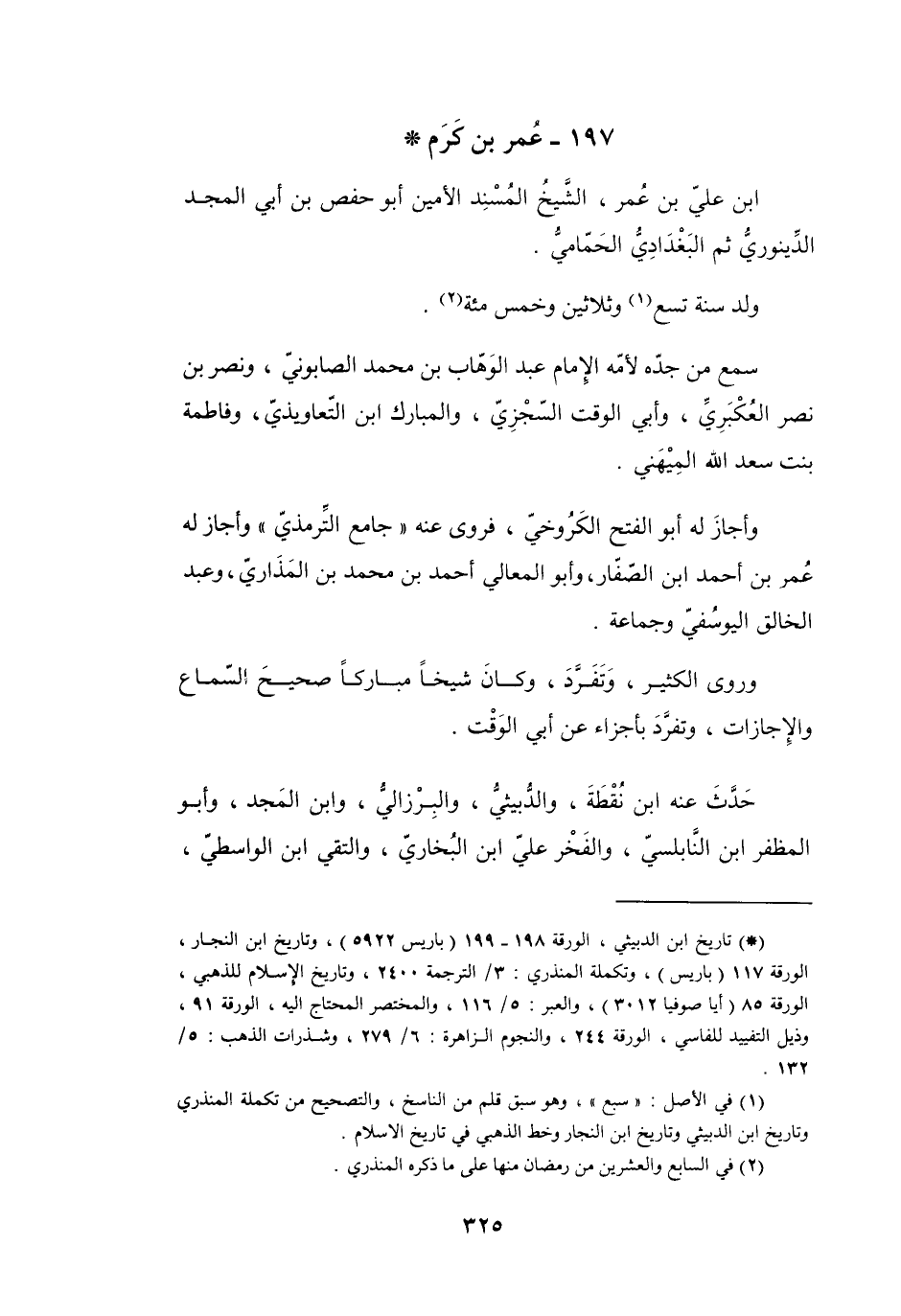 197 - عُمَرُ بنُ كَرَمِ بنِ عَلِيِّ بنِ عُمَرَ الدِّيْنَوَرِيُّ *