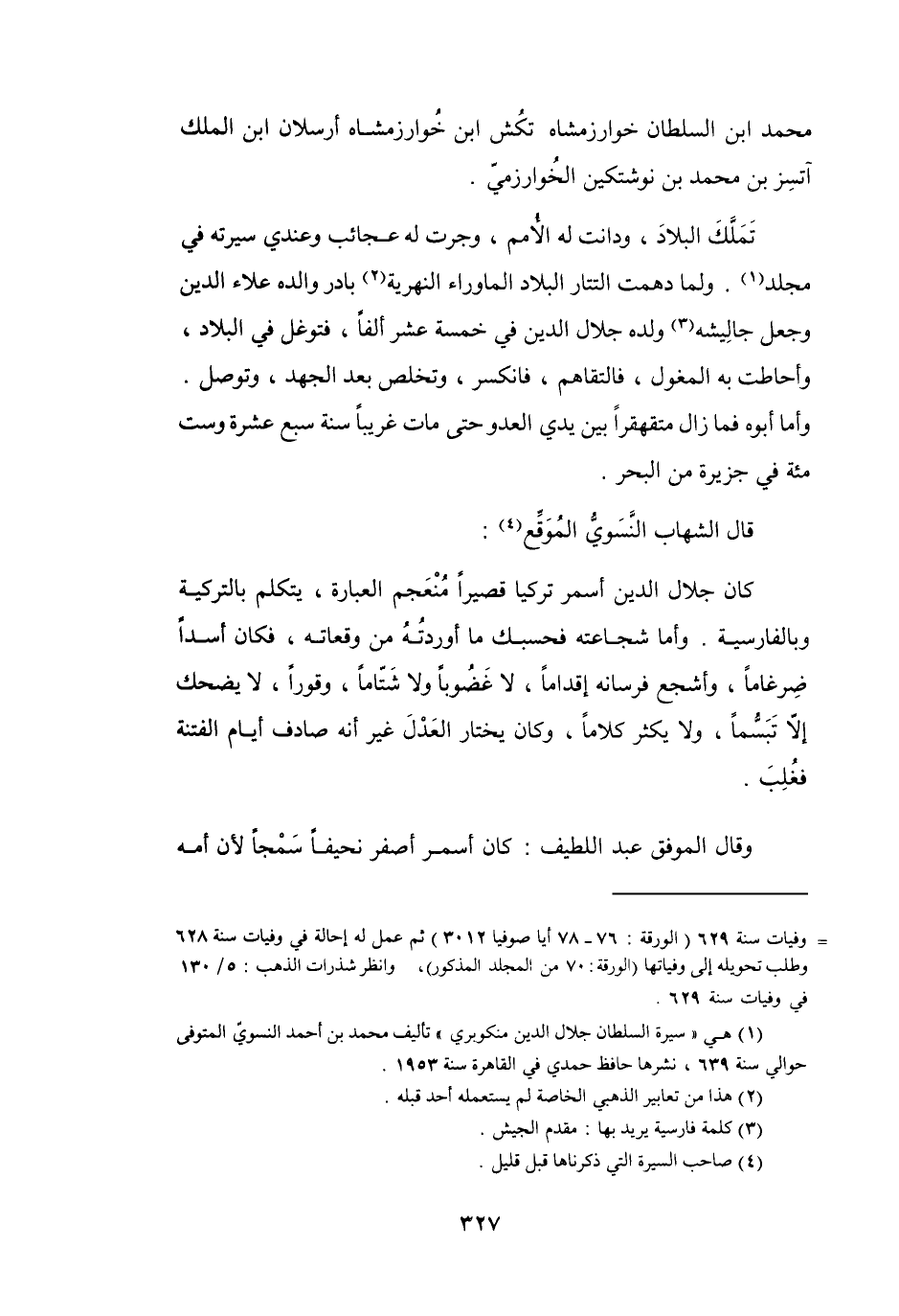 (1) هي " سيرة السلطان جلال الدين منكوبري " تأليف محمد بن أحمد النسوي المتوفى حوالي سنة 639، ونشرها حافظ حمدي في القاهرة سنة 1953.