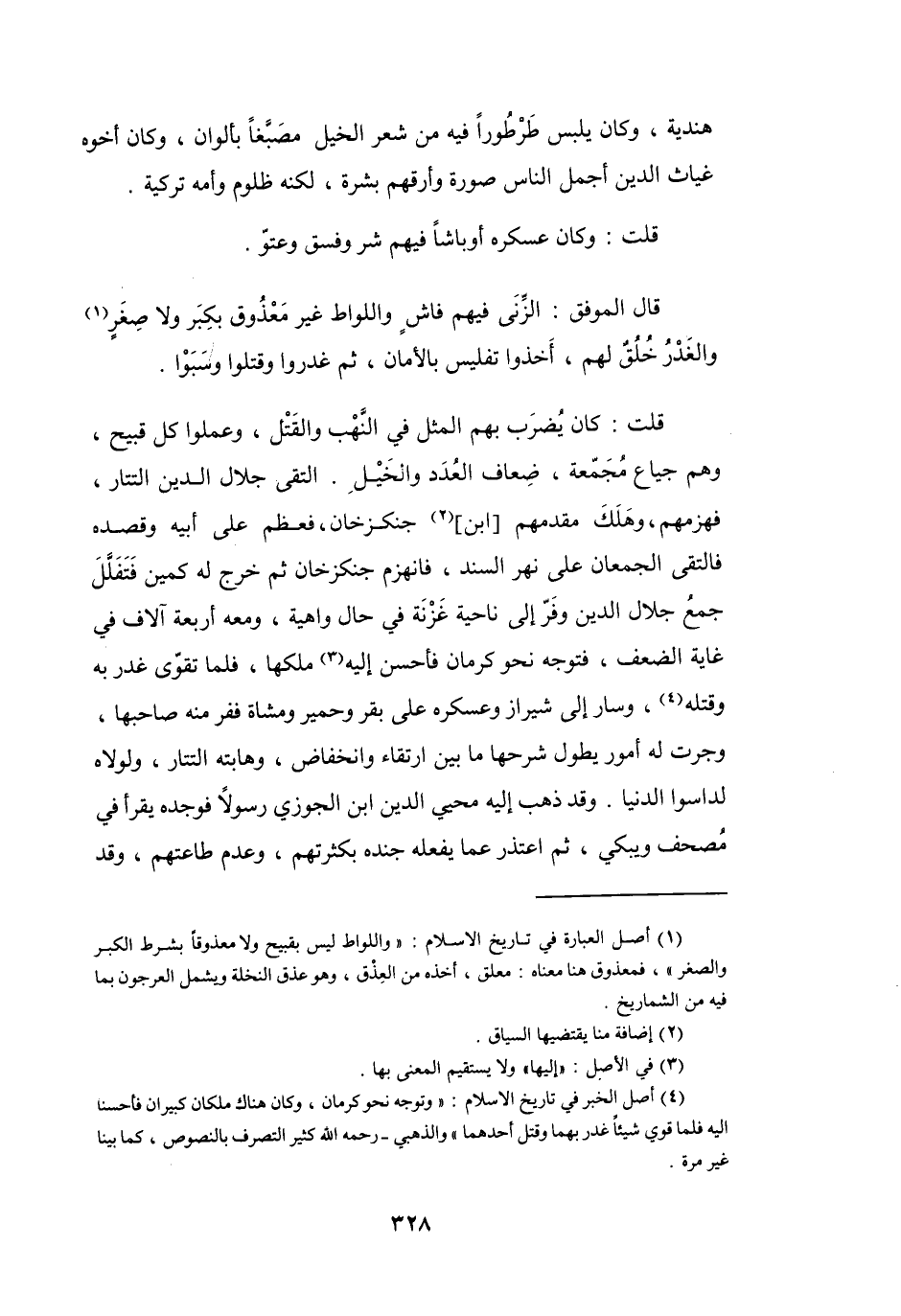 قُلْتُ: كَانَ يُضْرَبُ بِهِمُ المَثَلُ فِي النَّهْبِ وَالقَتلِ، وَعَمِلُوا كُلَّ قَبِيحٍ، وَهُم جِيَاعٌ مُجَمِّعَةٌ، ضِعَافُ العُدَدِ وَالخيلِ، التقَى جَلاَلُ الدِّيْنِ التَّتَارَ فَهَزمَهُم، وَهَلَكَ مُقدَّمُهُم ابْنُ (2) جِنْكِزْ خَان، فَعظُمَ عَلَى أَبِيْهِ، وَقصدَهُ، فَالتَقَى الجمعَانِ عَلَى نَهْرِ السِّنْدِ، فَانْهَزَم جِنْكِزْ خَان، ثُمَّ خَرَجَ لَهُ كَمِينٌ، فَتفلَّلَ جَمعُ جَلاَلِ الدِّيْنِ، وَفَرَّ إِلَى نَاحِيَةِ غَزْنَةَ فِي حَالٍ وَاهيَةٍ، وَمَعَهُ أَرْبَعَةُ آلاَفٍ فِي غَايَةِ الضَّعْفِ، فَتوجَّهَ نَحْو كِرْمَانَ، فَأَحْسَنَ إِلَيْهِ (3) مَلِكُهَا، فَلَمَّا تَقَوَّى، غدَرَ بِهِ وَقتلَهُ (4) ، وَسَارَ إِلَى شِيْرَازَ، وَعَسْكَرُهُ عَلَى بَقَرٍ وَحَمِيْرٍ وَمشَاةٌ، فَفَرَّ مِنْهُ صَاحِبُهَا، وَجَرَتْ لَهُ أُمُوْرٌ يَطولُ شَرحُهَا، مَا بَيْنَ ارْتقَاءٍ وَانخفَاضٍ، وَهَابَتْهُ التَّتَارُ، وَلَولاَهُ لَدَاسُوا الدُّنْيَا، وَقَدْ ذَهَبَ إِلَيْهِ مُحْيِي الدِّيْنِ ابْنُ الجَوْزِيِّ رَسُوْلاً، فَوَجَدَهُ يَقرَأُ فِي مُصحَفٍ وَيَبْكِي.
