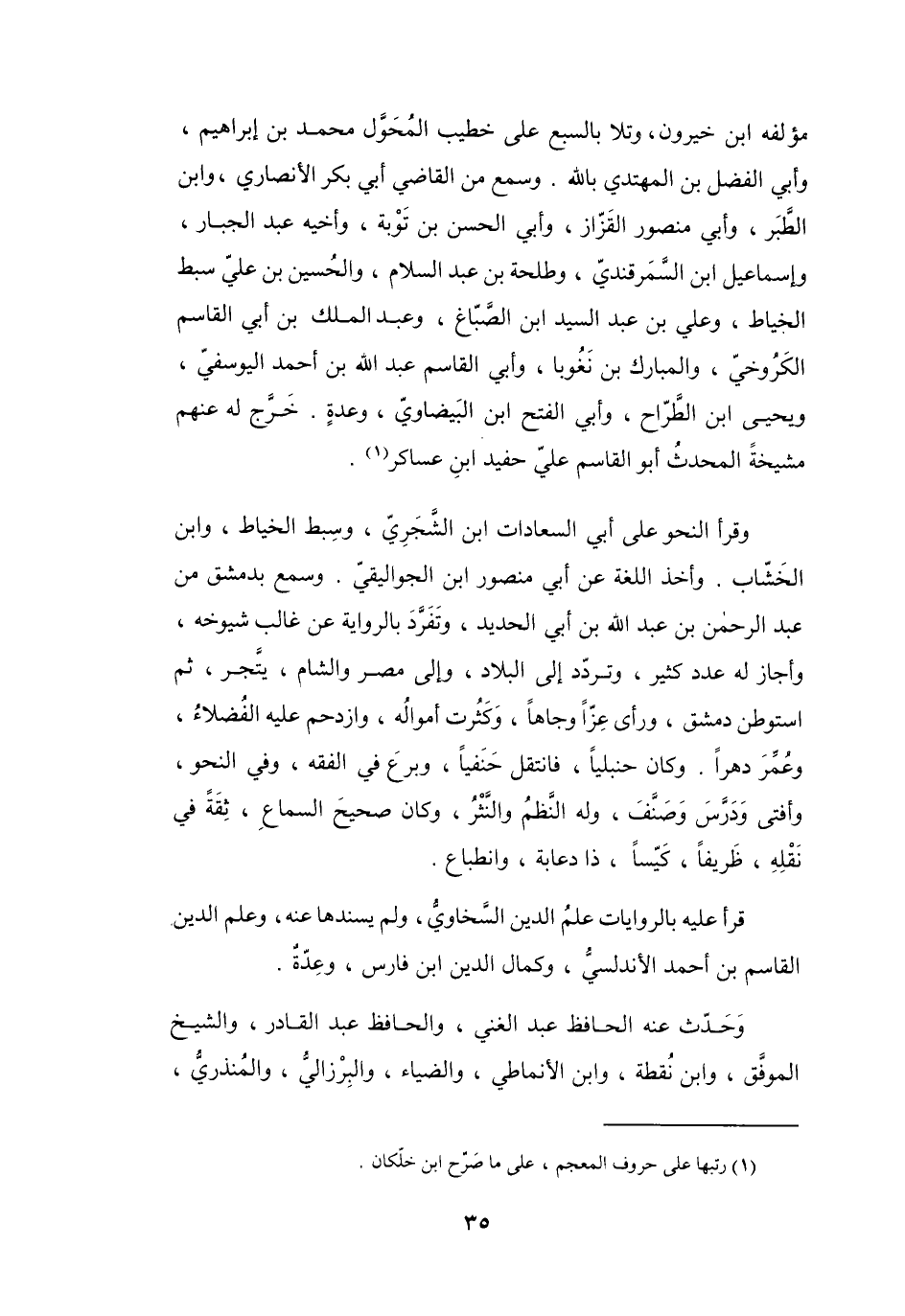 مُؤلِّفِهِ ابْنِ خَيْرُوْنَ، وَتَلاَ بِالسَّبْعِ عَلَى خَطِيْبِ المُحَوَّلِ مُحَمَّدِ بنِ إِبْرَاهِيْمَ، وَأَبِي الفَضْلِ بنِ المُهْتَدِي بِاللهِ.