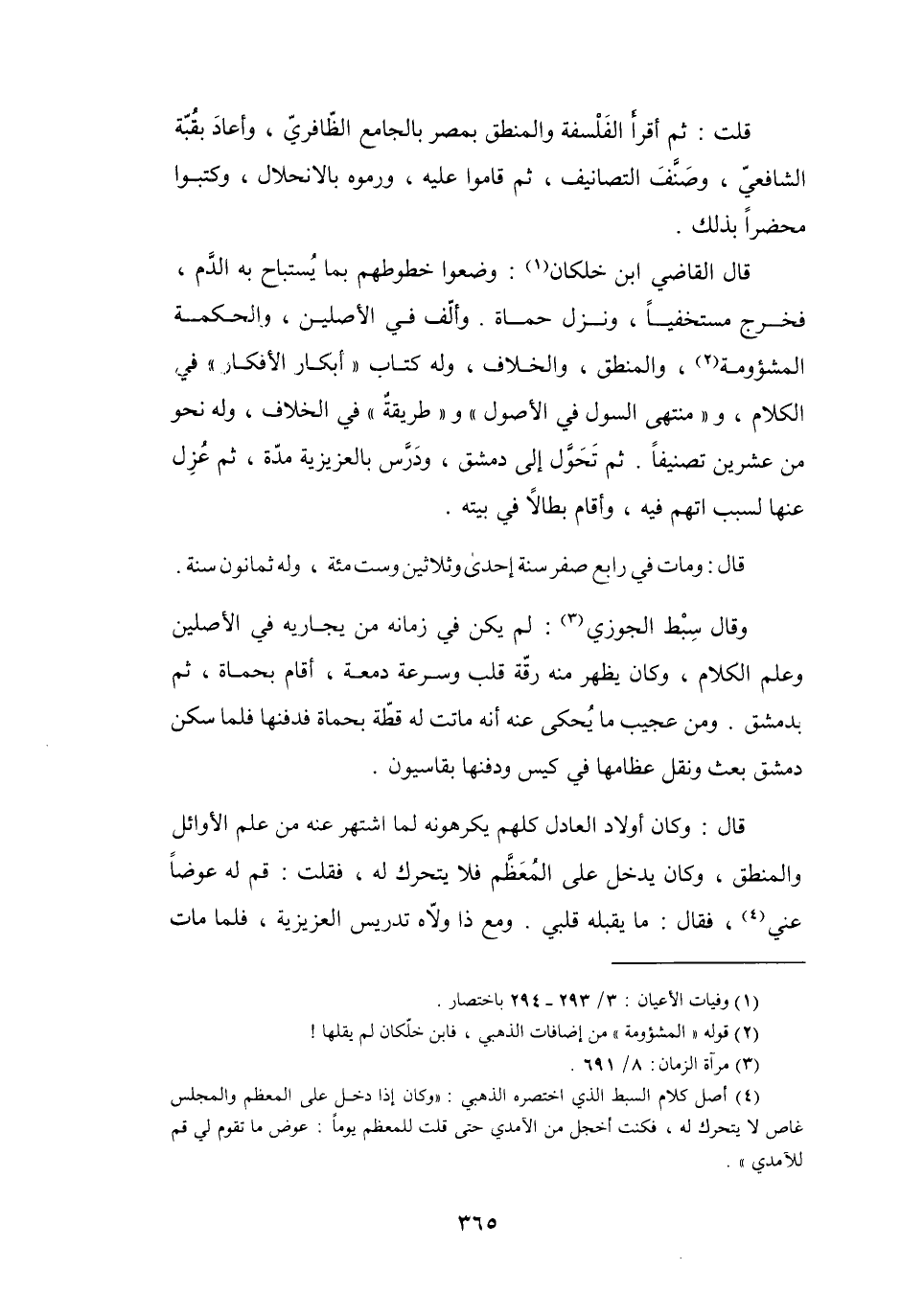 (4) أصل كلام السبط الذي اختصره الذهبي: " وكان إذا دخل على المعظم والمجلس غاص لا يتحرك له، فكنت أخجل من الآمدي حتى قلت للمعظم يوما: عوض ما تقوم لي قم للآمدي ".