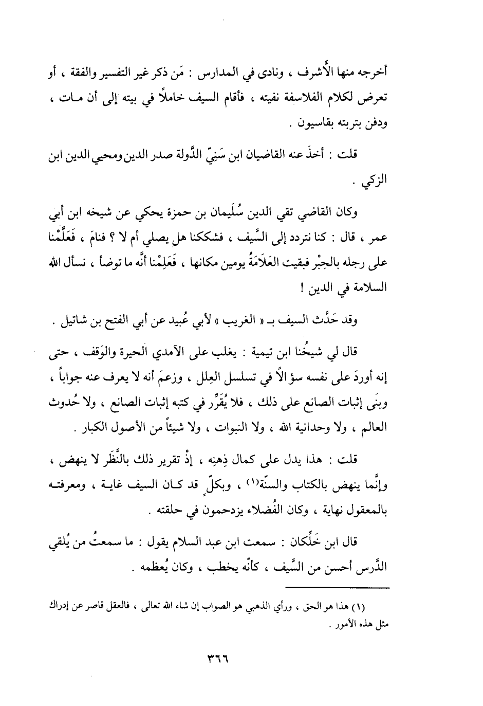 قُلْتُ: هَذَا يَدلّ عَلَى كَمَال ذِهنِه، إِذْ تَقرِير ذَلِكَ بِالنَّظَرِ لاَ يَنهض، وَإِنَّمَا يَنهض بِالكِتَابِ وَالسُّنَّةِ (1) ، وَبِكُلٍّ قَدْ كَانَ السَّيْفُ غَايَةً، وَمَعْرِفَتُه بِالمَعْقُوْل نِهَايَةً، وَكَانَ الفُضَلاَءُ يَزْدَحِمُوْنَ فِي حَلْقَتِهِ.