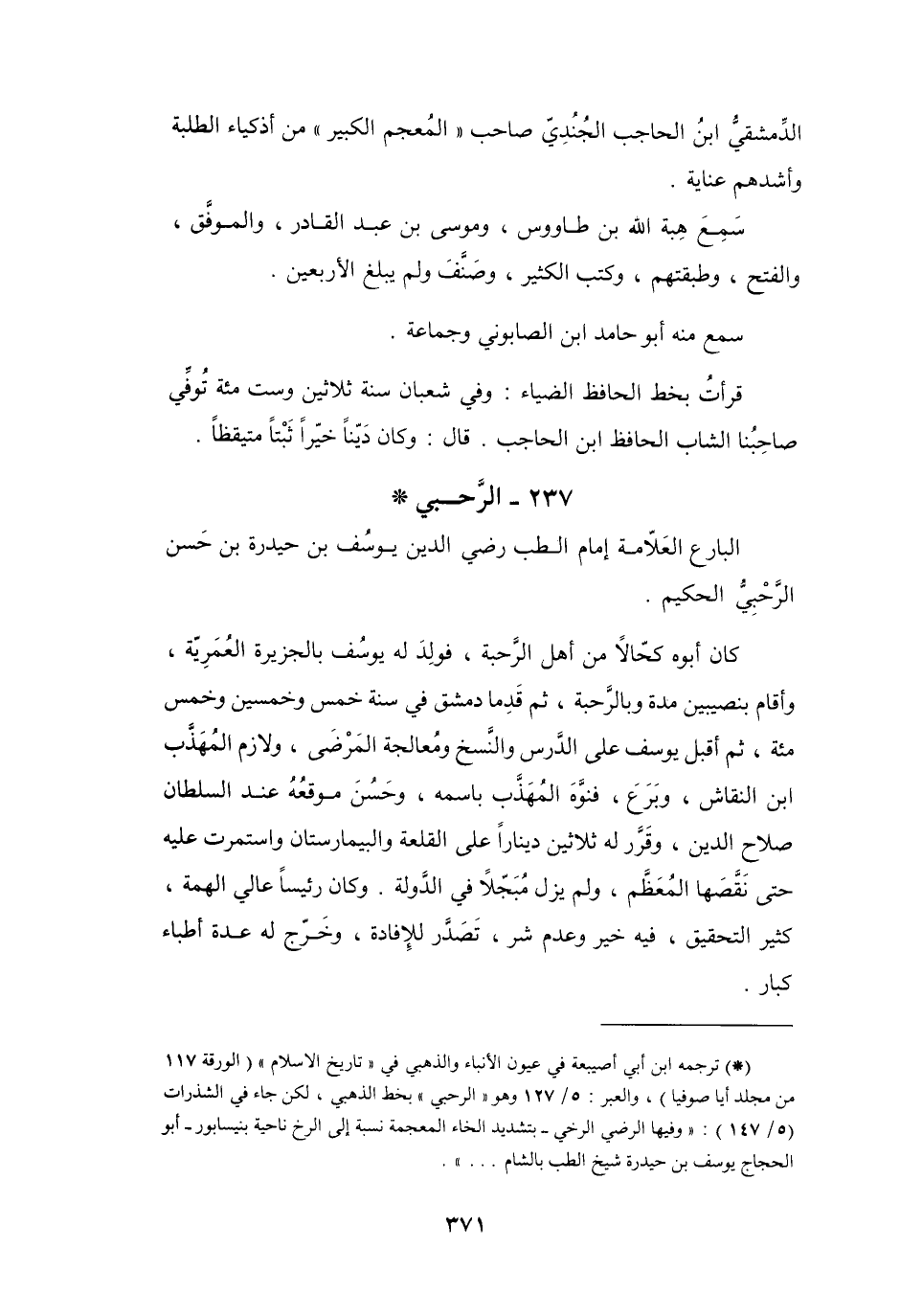 (*) ترجمة ابن أبي أصيبعة في عيون الانباء والذهبي في " تاريخ الإسلام " (الورقة 117 من مجلد أيا صوفيا) ، والعبر: 5 / 127 وهو " الرحبي " بخط الذهبي، لكن جاء في الشذرات: " وفيها الرضي الرخي - بتشديد الخاء المعجمة نسبة إلى الرخ ناحية بنيسابور - أبو الحجاج يوسف بن حيدرة شيخ الطب بالشام ... ".