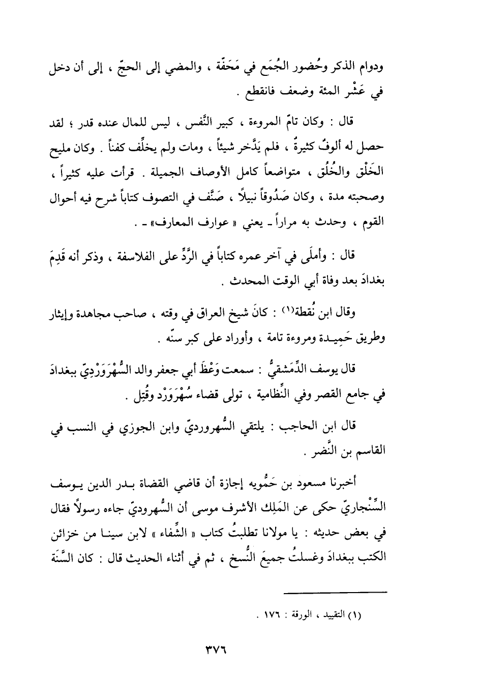 أَنَّ السُّهْرَوَرْدِيَّ جَاءهُ رَسُوْلاً، فَقَالَ فِي بَعْضِ حَدِيْثِهِ: يَا مَوْلاَنَا، تَطلبتُ كِتَابَ (الشِّفَاءِ) لابْنِ سِيْنَا مِنْ خَزَائِنِ الكُتُبِ بِبَغْدَادَ، وَغَسَلْتُ جَمِيْعَ النُّسَخِ، ثُمَّ فِي أَثْنَاءِ الحَدِيْثِ قَالَ: كَانَ السَّنَةَ