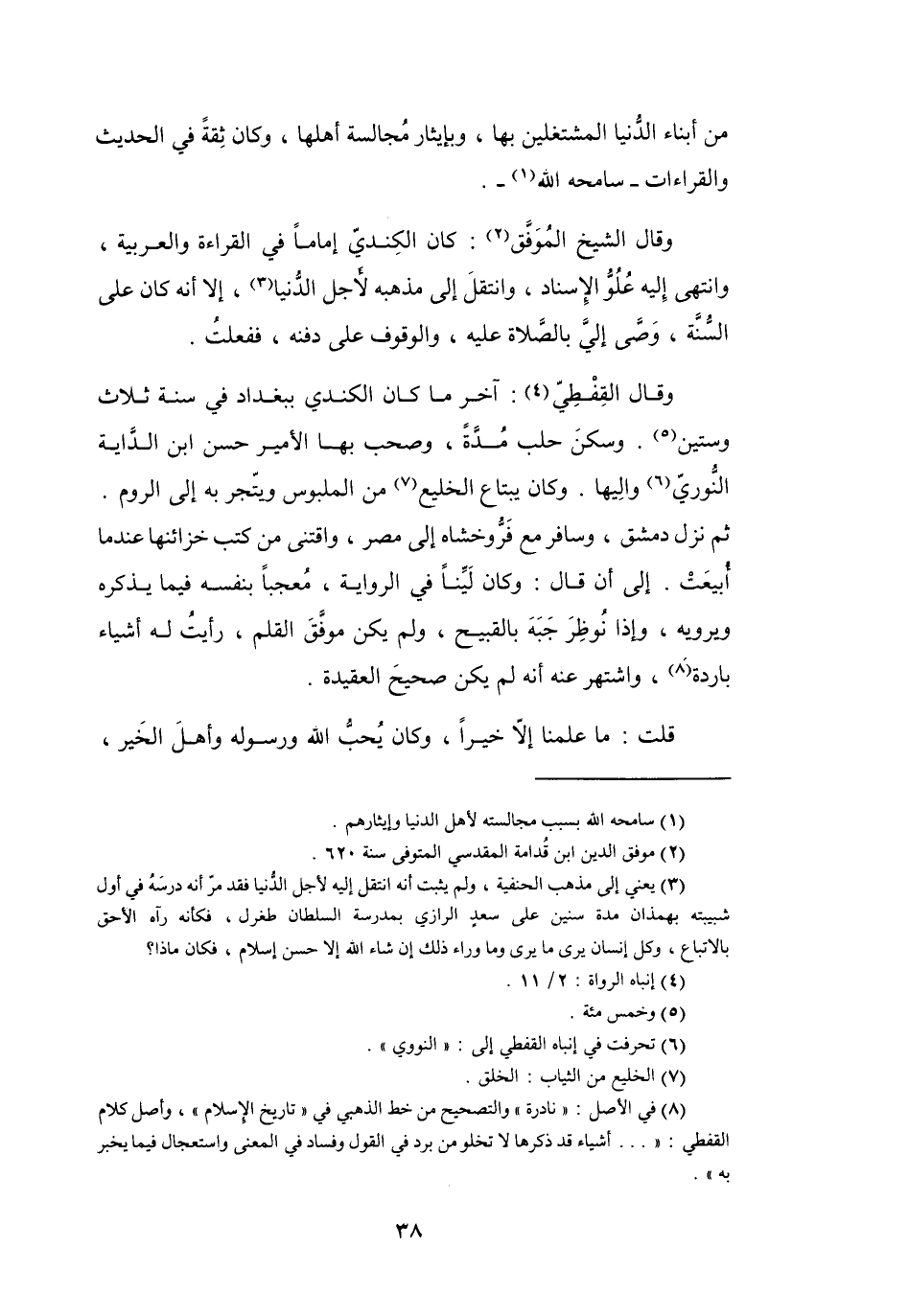 وَقَالَ الشَّيْخُ المُوَفَّقُ (2) : كَانَ الكِنْدِيُّ إِمَاماً فِي القِرَاءةِ وَالعَرَبِيَّةِ، وَانْتَهَى إِلَيْهِ عُلُوُّ الإِسْنَادِ، وَانْتَقَلَ إِلَى مَذْهَبِهِ لأَجْلِ الدُّنْيَا (3) ، إِلاَّ أَنَّهُ كَانَ عَلَى السُّنَّةِ، وَصَّى إِلَيَّ بِالصَّلاَةِ عَلَيْهِ، وَالوُقُوْفِ عَلَى دفنِهِ، فَفَعَلتُ.