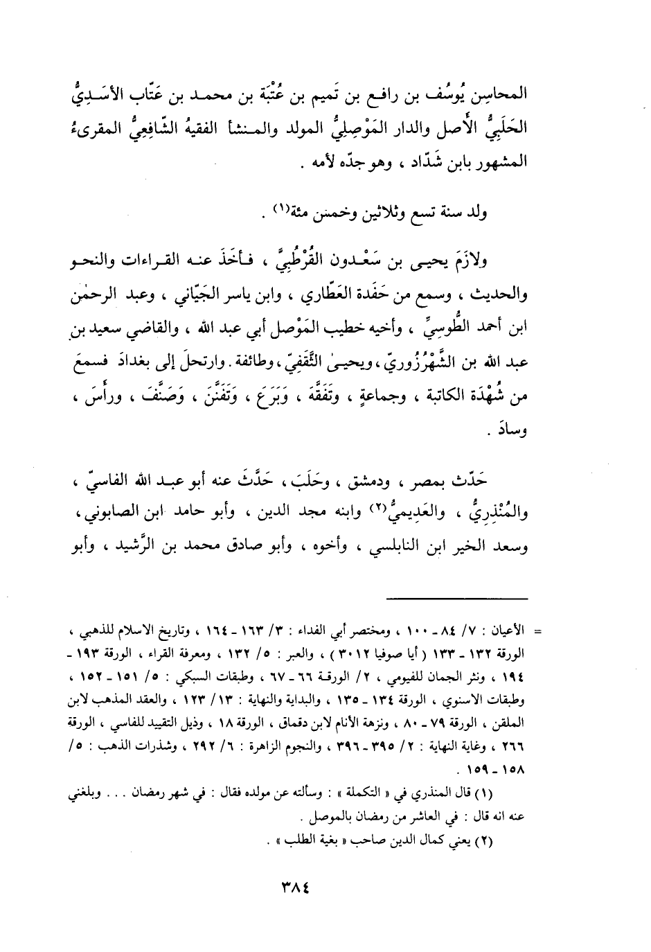 (1) قال المنذري في " التكملة ": وسألته عن مولده فقال: في شهر رمضان ... وبلغني عنه انه قال: في العاشر من رمضان بالموصل.