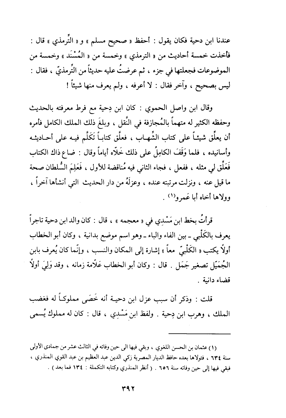 قُلْتُ: وَذَكَرَ أَنَّ سَبَبَ عَزْلِ ابْنِ دِحْيَةَ أَنَّهُ خَصَى مَمْلُوْكاً لَهُ، فَغَضِبَ الْملك، وَهَرَبَ ابْنُ دِحْيَةَ.