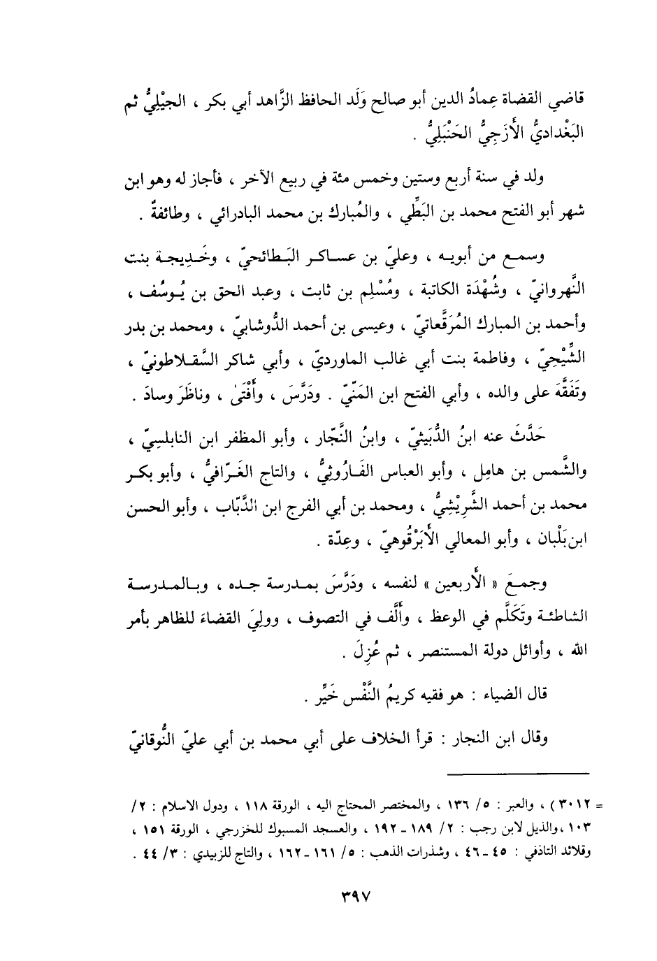 = 3012) ، والعبر: 5 / 136، والمختصر المحتاج إليه، الورقة 118، ودول الإسلام: 2 / 103، والذيل لابن رجب: 2 / 189 - 192، والعسجد المسبوك للخزرجي، الورقة 151، وقلائد التاذفي: 45 - 46، وشذرات الذهب: 5 / 161 - 162، والتاج للزبيدي: 3 / 44.