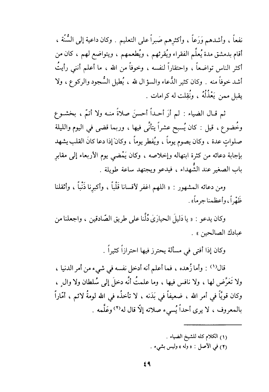 ثُمَّ قَالَ الضِّيَاءُ: لَمْ أَرَ أَحَداً أَحْسَنَ صَلاَةً مِنْهُ وَلاَ أَتَمَّ، بِخُشُوْعٍ وَخُضُوْعٍ، قِيْلَ: كَانَ يُسبِّحُ عَشْراً يَتَأَنَّى فِيْهَا، وَرُبَّمَا قَضَى فِي اليَوْمِ وَاللَّيْلَةِ صَلَوَاتٍ عِدَّةٍ، وَكَانَ يَصُوْمُ يَوْماً، وَيُفْطِر يَوْماً، وَكَانَ إِذَا دَعَا، كَانَ القَلْب يَشْهَدُ بِإِجَابَة دُعَائِهِ مِنْ كَثْرَةِ ابْتِهَالِهِ وَإِخْلاَصِهِ، وَكَانَ يَمضِي يَوْمَ الأَرْبعَاءِ إِلَى مَقَابِرِ بَابِ الصَّغِيْرِ عِنْدَ الشُّهَدَاء، فَيَدْعُوا وَيَجْتَهِدُ سَاعَةً طَوِيْلَةً.