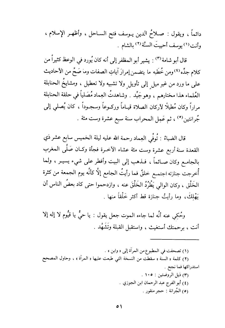 قَالَ أَبُو شَامَةَ (3) : يُشير أَبُو المُظَفَّرِ إِلَى أَنَّهُ كَانَ يُورد فِي الوَعْظِ كَثِيْراً مِنْ كَلاَمِ جَدِّهِ (4) وَمِنْ خُطَبِهِ مَا يَتَضمَّنُ إِمْرَارَ آيَاتِ الصِّفَاتِ وَمَا صَحَّ مِنَ الأَحَادِيْثِ عَلَى مَا وَردَ مِنْ غَيْرِ مَيْلٍ إِلَى تَأْوِيْلٍ وَلاَ تَشْبِيهٍ وَلاَ تَعْطِيلٍ، وَمَشَايِخُ الحَنَابِلَةِ العُلَمَاءُ هَذَا مُخْتَارُهُم، وَهُوَ جَيِّدٌ، وَشَاهَدتُ العِمَادَ مُصَلِّياً فِي حَلْقَةِ الحَنَابِلَةِ مِرَاراً، وَكَانَ مُطِيلاً لأَرْكَانِ الصَّلاَةِ قِيَاماً وَرُكُوْعاً وَسُجُوداً، كَانَ يُصَلِّي إِلَى جُرَانتين (5) ، ثُمَّ عَمِلَ المِحْرَابَ سَنَةَ سَبْعَ عَشْرَةَ وَسِتِّ مائَةٍ.