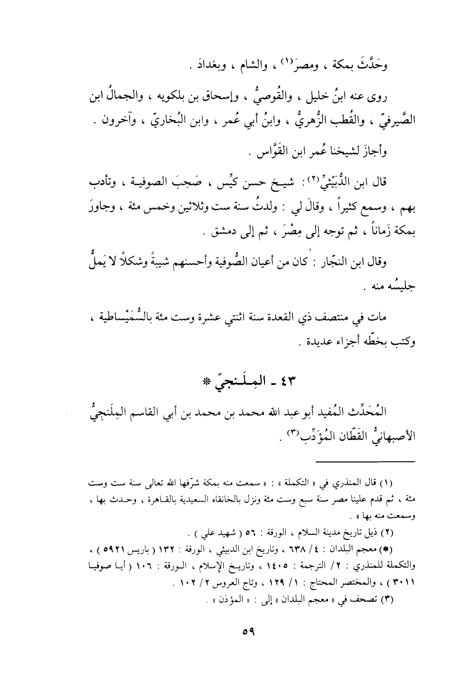 (*) معجم البلدان: 4 / 638، وتاريخ ابن الدبيثي، الورقة: 132 (باريس 5921) ، والتكملة للمنذري: 2 / الترجمة: 1405، وتاريخ الإسلام، الورقة: 106 (أيا صوفيا 3011) ، والمختصر المحتاج: 1 / 129، وتاج العروس 2 / 102.