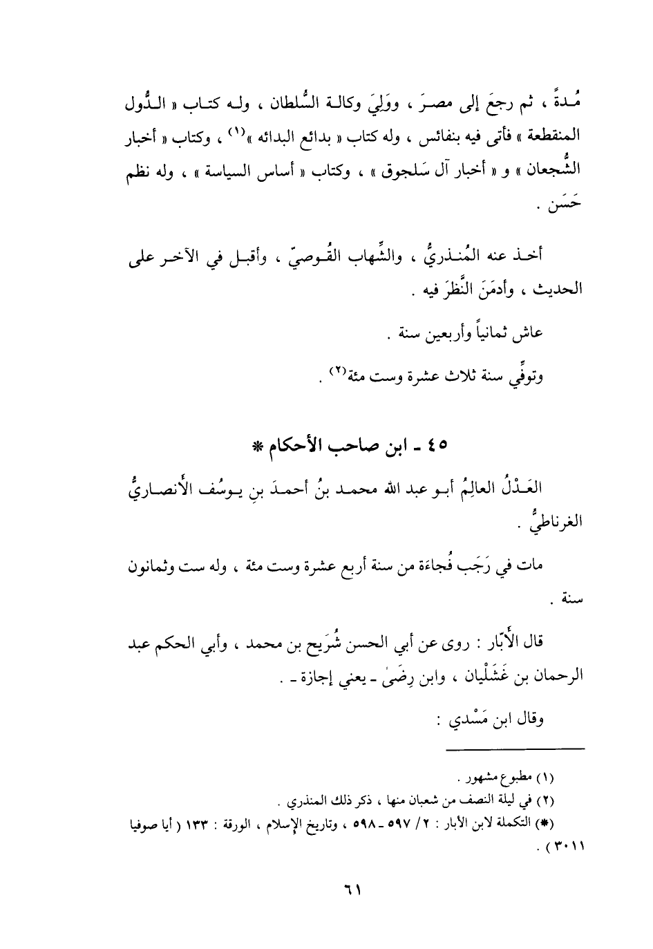 (*) التكملة لابن الابار: 2 / 597 - 598، وتاريخ الإسلام، الورقة: 133 (أياصوفيا 3011) .