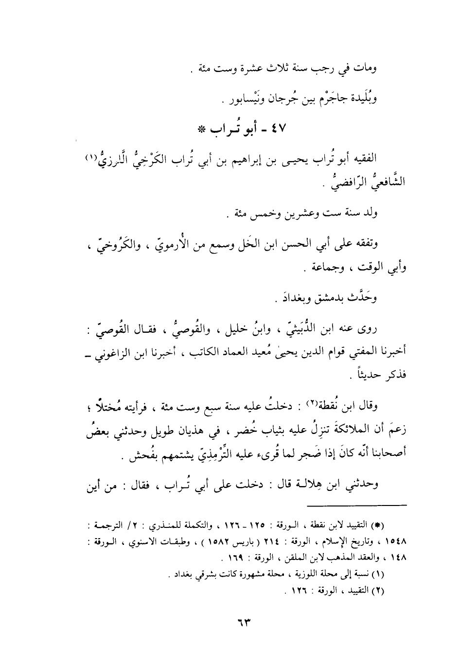 (*) التقييد لابن نقطة، الورقة: 125 - 126، والتكملة للمنذري: 2 / الترجمة:، 1548 وتاريخ الإسلام، الورقة: 214 (باريس 1582) ، وطبقات الاسنوي، الورقة: 148، والعقد المذهب لابن الملقن، الورقة: 169.