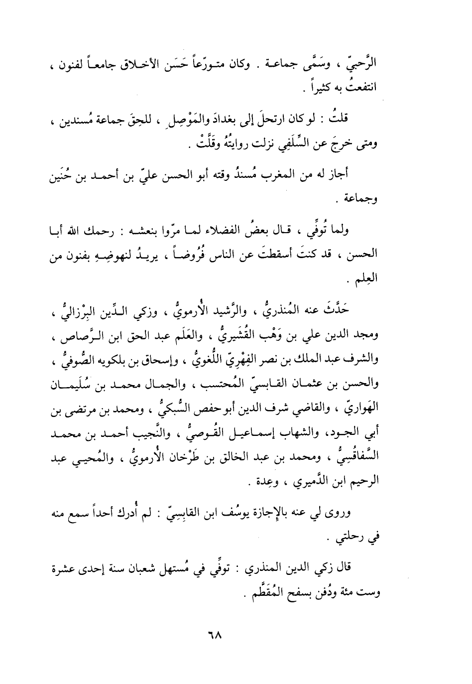 الرَّحْبِيَّ ... ، وَسَمَّى جَمَاعَةً، وَكَانَ مُتوَرِّعاً، حَسَنَ الأَخْلاَقِ، جَامِعاً لِفنُوْنٍ، انْتَفَعتُ بِهِ كَثِيْراً.