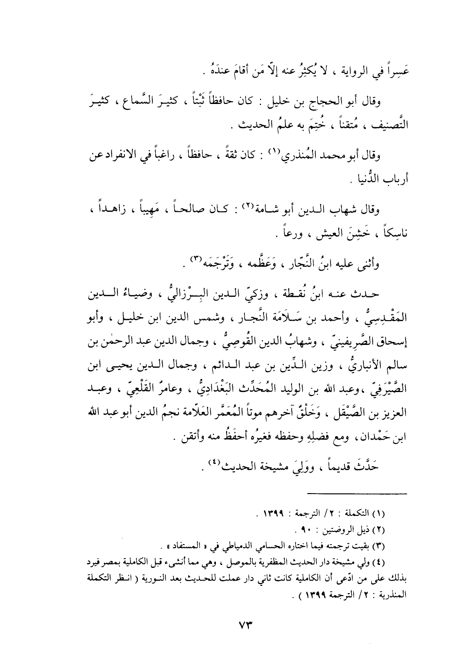 بذلك على من ادعى أن الكاملية كانت ثاني دار عملت للحديث بعد النورية (انظر التكملة المنذرية: 2 / الترجمة 1399) .