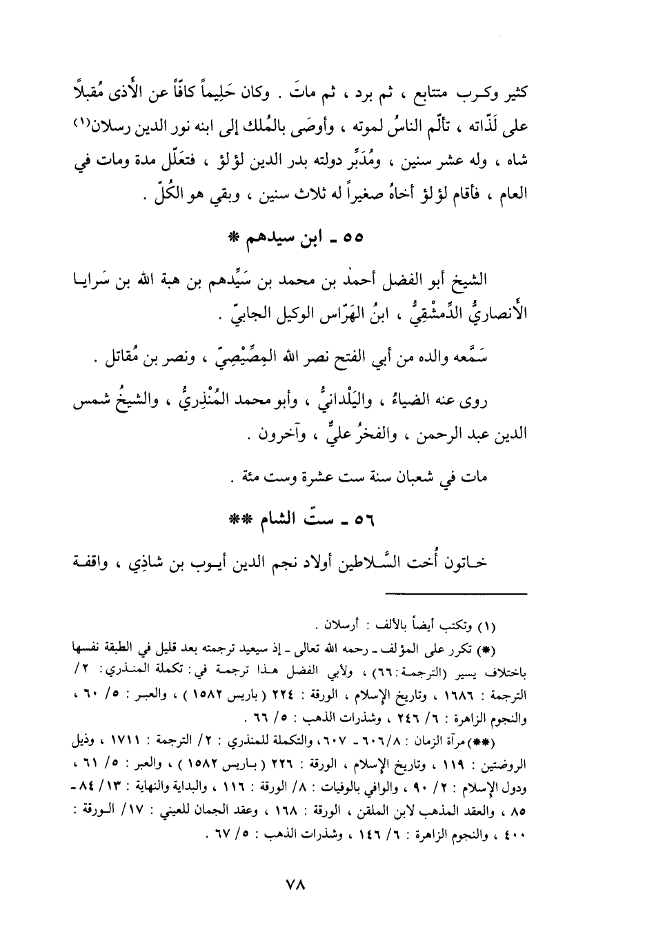 (*) تكرر على المؤلف - رحمه الله تعالى - إذ سيعيد ترجمته بعد قليل في الطبقة نفسها باختلاف يسير (الترجمة: 66) ، ولابي الفضل هذا ترجمة في: تكملة المنذري: 2 / الترجمة: 1686، وتاريخ الإسلام، الورقة: 224 (باريس 1582) ، والعبر: 5 / 60، والنجوم الزاهرة: 6 / 246، وشذرات الذهب: 5 / 66.