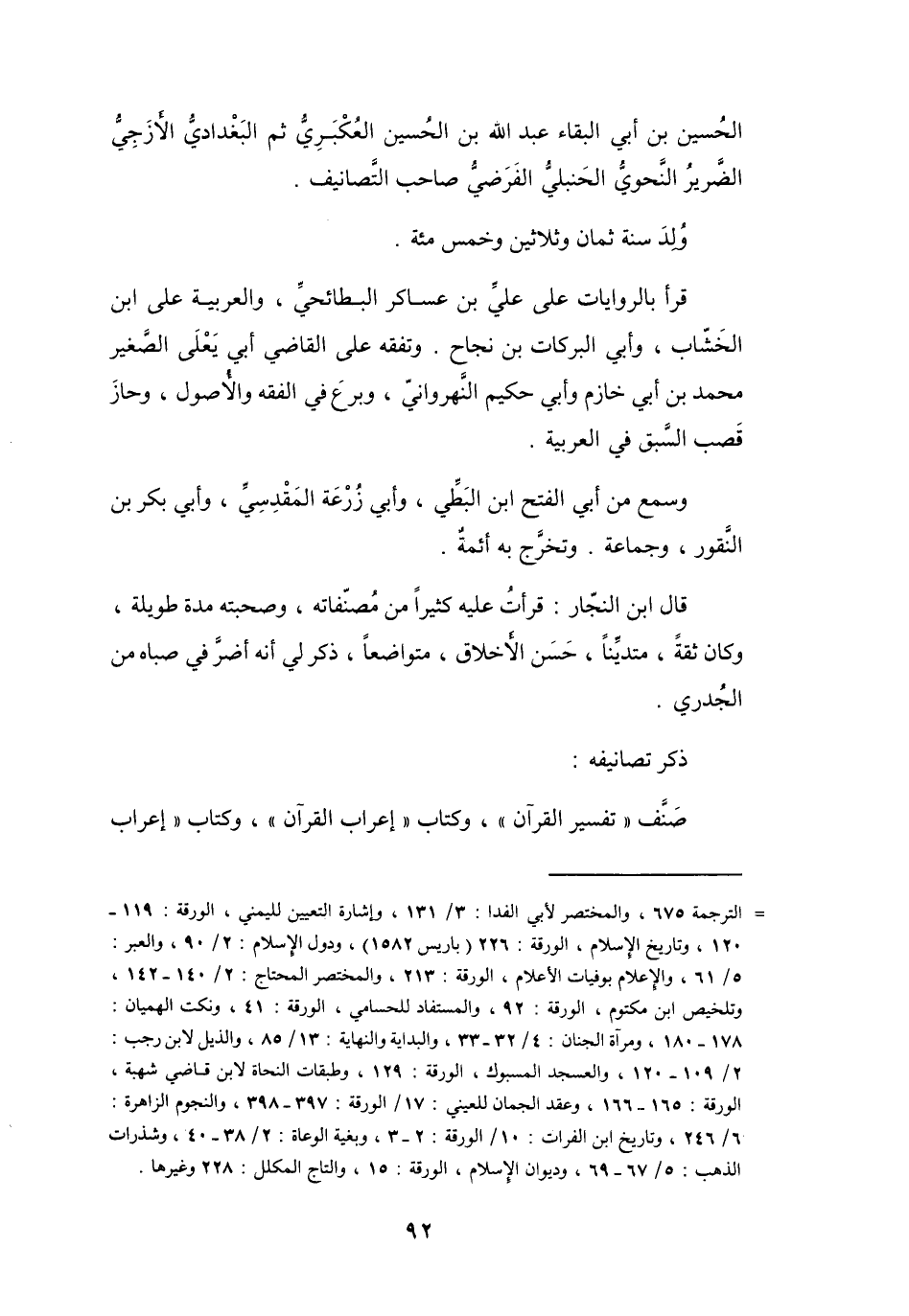 الحُسَيْنِ ابنِ أَبِي البَقَاءِ عَبْدِ اللهِ بنِ الحُسَيْنِ العُكْبَرِيُّ، ثُمَّ البَغْدَادِيُّ، الأَزَجِيُّ، الضَّرِيْرُ، النَّحْوِيُّ، الحَنْبَلِيُّ، الفَرَضِيُّ، صَاحِبُ التَّصَانِيْفِ.