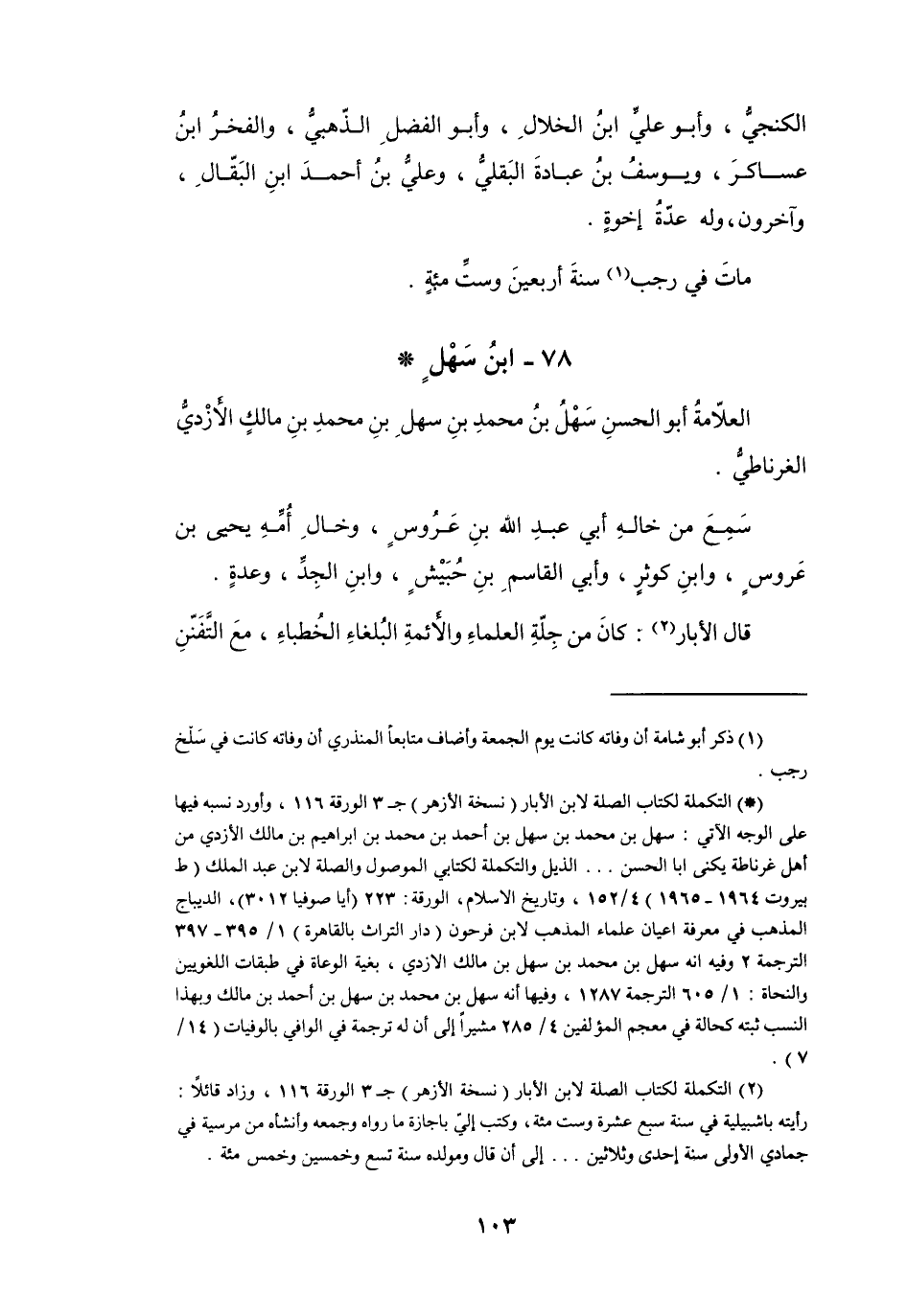 (2) التكملة لكتاب الصلة لابن الابار (نسخة الأزهر) ج 3 الورقة 116، وزاد قائلا: رأيته باشبيلية في سنة سبع عشرة وست مئة، وكتب إلي باجازة ما رواه وجمعه وأنشأه من مرسية في جمادي الأولى سنة إحدى وثلاثين..إلى أن قال ومولده سنة تسع وخمسين وخمس مئة.