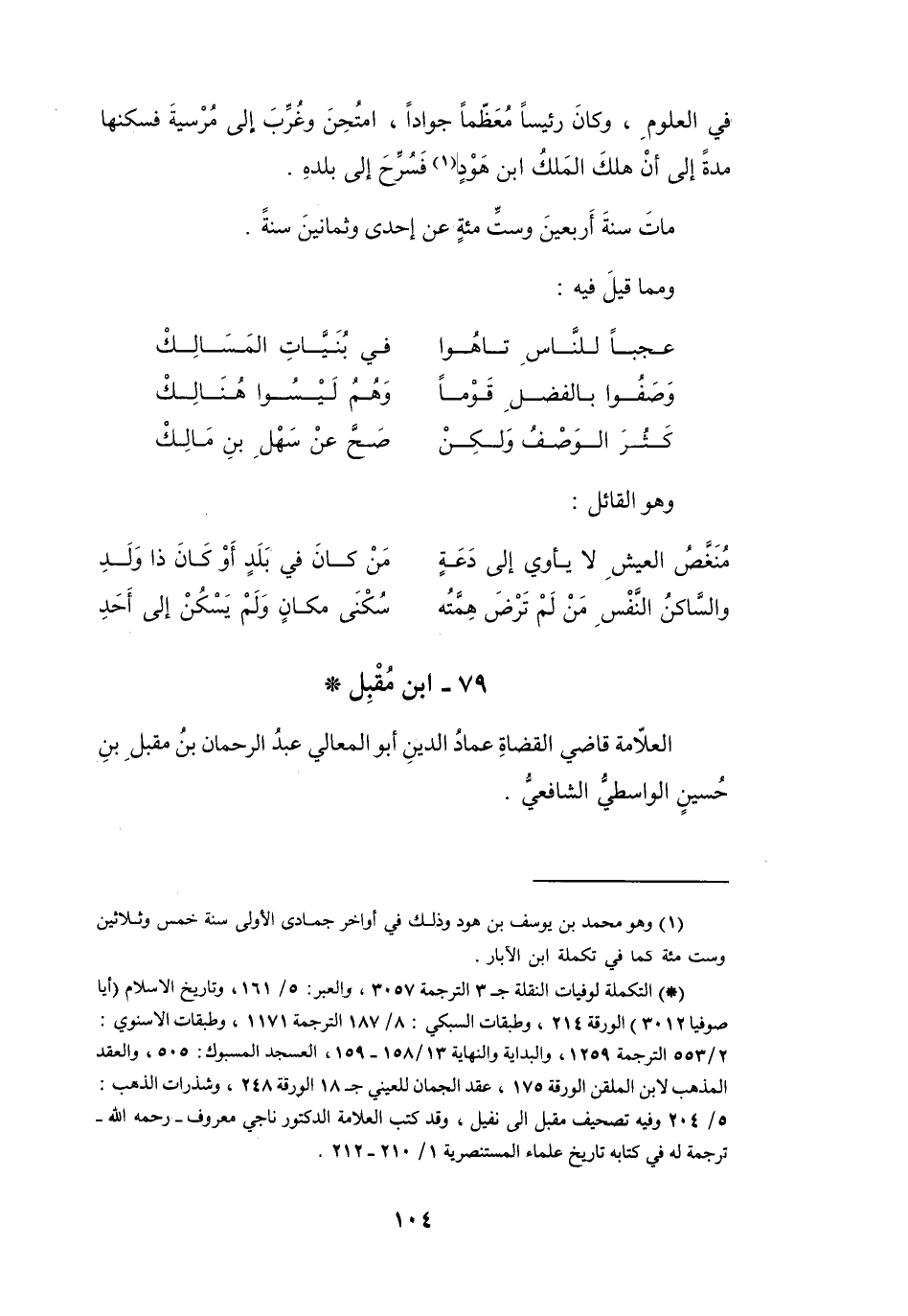 (*) التكملة لوفيات النقلة ج 3 الترجمة 3057، والعبر: 5 / 161، وتاريخ الإسلام (أيا صوفيا 3012) الورقة 214، وطبقات السبكي: 8 / 187 الترجمة 1171، وطبقات الاسنوي: 2 / 553 الترجمة 1259، والبداية والنهاية 13 / 158 - 159، العسجد المسبوك: 505، والعقد المذهب لابن الملقن الورقة 175، عقد الجمان للعيني ج 18 الورقة 248، وشذرات الذهب: 5 / 204 وفيه تصحيف مقبل إلى نفيل، وقد كتب العلامة الدكتور ناجي معروف - رحمه الله - ترجمة له في كتابه تاريخ علماء المستنصرية 1 / 210 - 212.