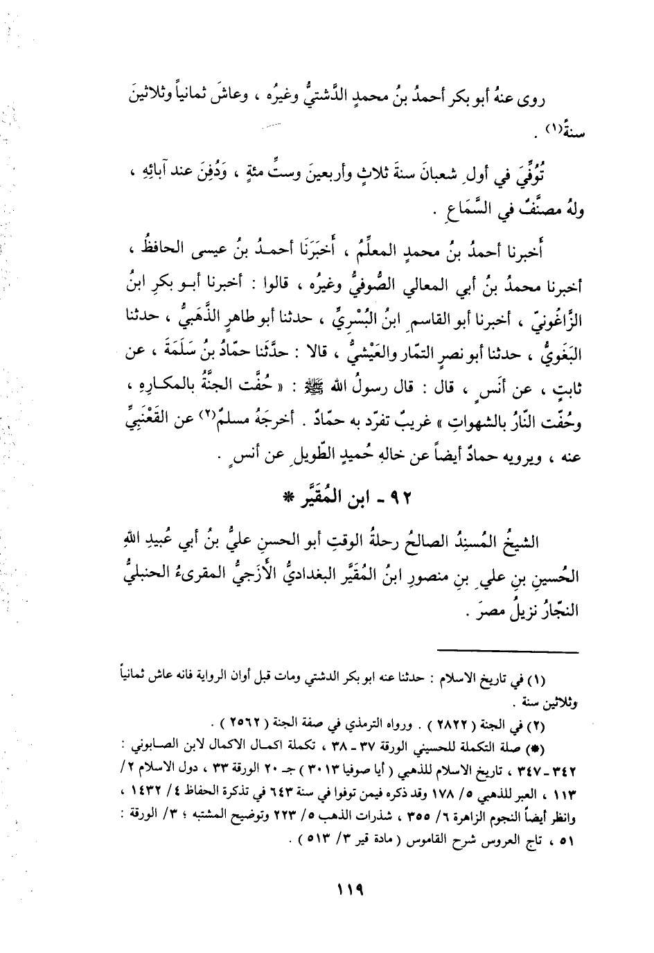 (1) في تاريخ الإسلام: حدثنا عنه أبو بكر الدشتي ومات قبل أوان الرواية فانه عاش ثمانيا وثلاثين سنة.
