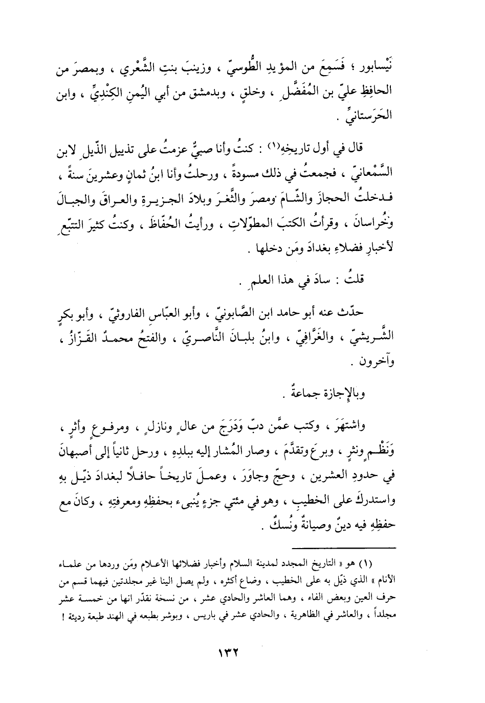 قَالَ فِي أَوَّلِ (تَارِيْخِهِ (1)) : كُنْتُ وَأَنَا صَبِيٌّ عزمتُ عَلَى تَذيِيلِ (الذَّيلِ) لابْنِ السَّمْعَانِيّ، فَجمعتُ فِي ذَلِكَ مسودَةً، وَرحلتُ وَأَنَا ابْنُ ثَمَانٍ وَعِشْرِيْنَ سَنَةً، فَدَخَلتُ الحِجَازَ وَالشَّامَ وَمِصْرَ وَالثَّغْرَ وَبلاَدَ الجَزِيْرَةِ وَالعِرَاقَ وَالجِبَالَ وَخُرَاسَانَ، وَقَرَأْتُ الكُتُبَ المطوّلاَتِ، وَرَأَيْتُ الحُفَّاظَ، وَكُنْتُ كَثِيْرَ التَّتَبُّعِ لأَخْبَارِ فُضَلاَءِ بَغْدَادَ وَمَنْ دَخَلَهَا.