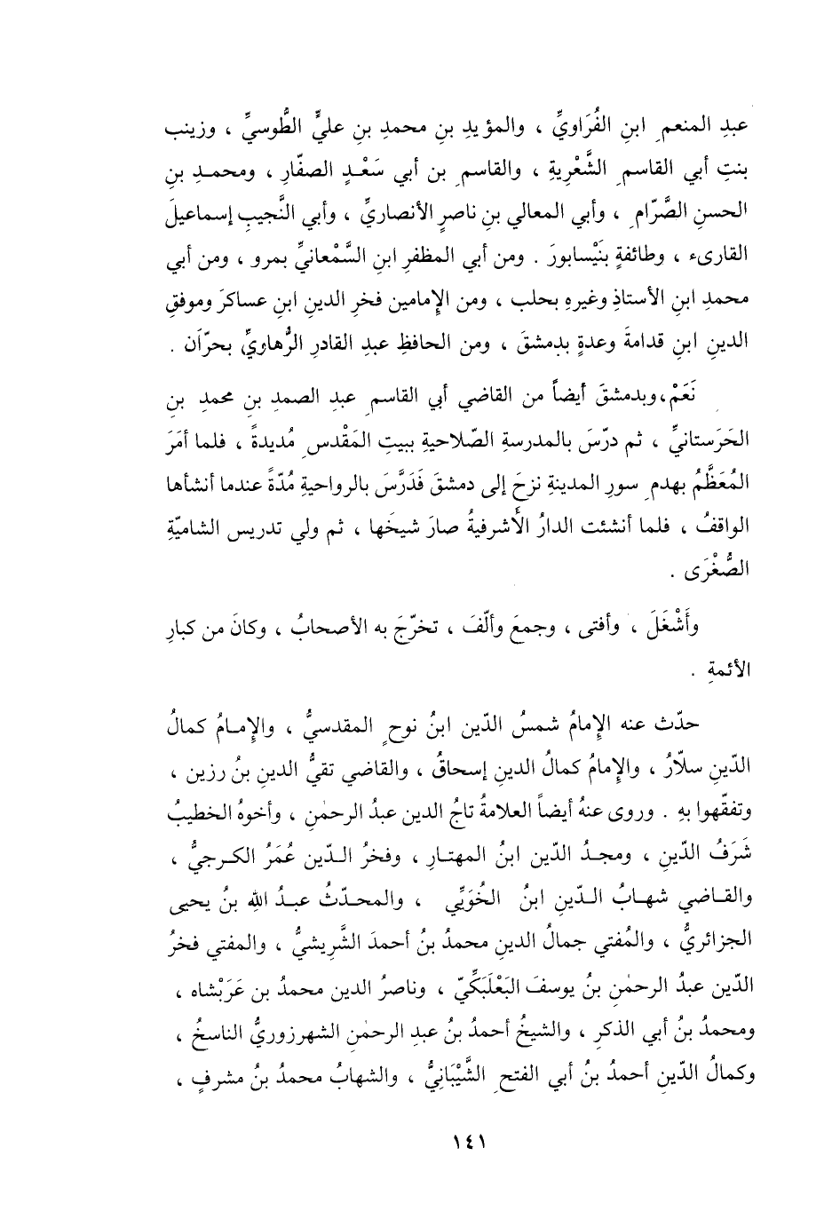 نَعَمْ، وَبِدِمَشْقَ أَيْضاً مِنَ: القَاضِي أَبِي القَاسِمِ عَبْدِ الصَّمَدِ بنِ مُحَمَّدِ بنِ الحَرَسْتَانِيِّ، ثُمَّ دَرّسَ بِالمَدْرَسَةِ الصَّلاَحيَةِ بِبَيْتِ المَقْدِسِ مُديدَةً، فَلَمَّا أَمَرَ المُعَظَّمُ بِهدمِ سُورِ المَدِيْنَةِ، نَزحَ إِلَى دِمَشْقَ، فَدَرَّسَ بِالروَاحيَةِ مُدَّةً عِنْدَمَا أَنشَأَهَا الوَاقفُ، فَلَمَّا أُنشِئْتِ الدَّارُ الأَشْرَفِيَةُ صَارَ شَيْخَهَا، ثُمَّ وَلِي تَدرِيسَ الشَّامِيّةِ الصُّغْرَى.