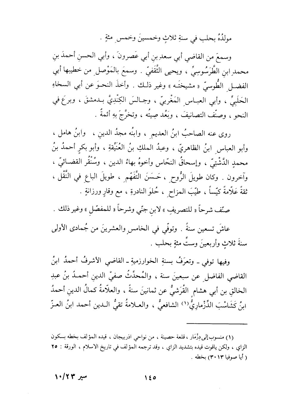 (1) منسوب إلى دزمار، قلعة حصينة، من نواحي اذربيجان، قيده المؤلف بخطه بسكون الزاي، ولكن ياقوت قيده بتشديد الزاي، وقد ترجمه المؤلف في تاريخ الإسلام، الورقة: 25 (أيا صوفيا 3013) بخطه.