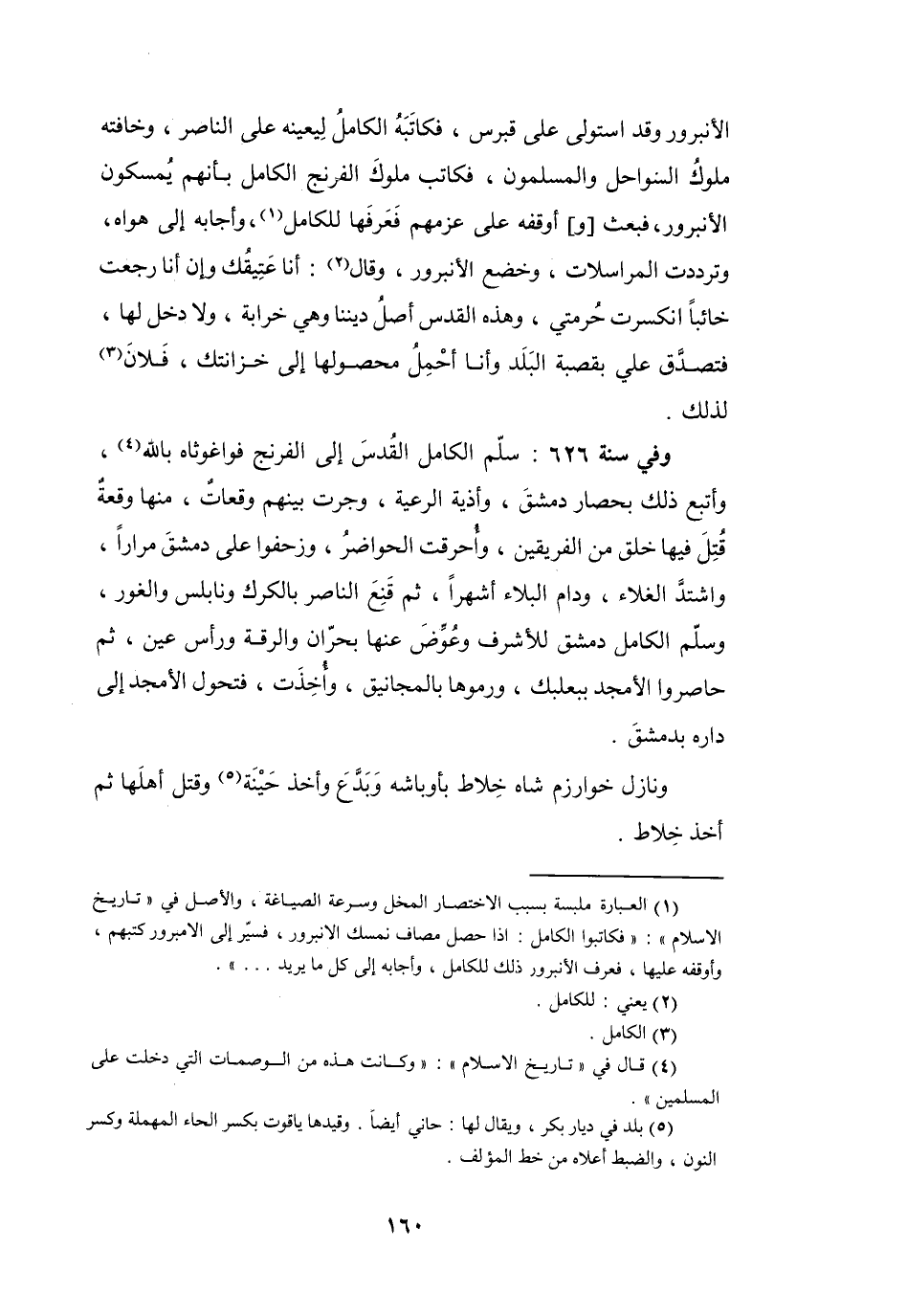 (1) العبارة ملبسة بسبب الاختصار المخل وسرعة الصياغة، والاصل في " تاريخ الإسلام ": فكاتبوا الكامل: إذا حصل مصاف نمسك الانبرور، فسير إلى الامبرور كتبهم، وأوقفه عليها، فعرف الانبرور ذلك للكامل، وأجابه إلى كل ما يريد..".