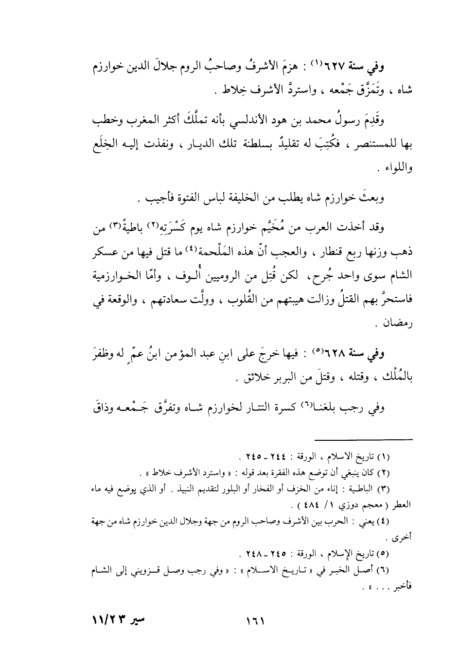 وَقَدْ أَخذتِ الْعَرَب مِنْ مُخَيَّم خُوَارِزْم شَاه يَوْمَ كَسْرَتِهِ (2) باطيَةً (3) مِنْ ذَهَبٍ وَزْنُهَا رُبُعُ قِنطَارٍ، وَالعجب أَنّ هَذِهِ المَلْحَمَة (4) مَا قُتل فِيْهَا مِنْ عَسْكَر الشَّامِ سِوَى وَاحِد جُرِحَ، لَكِنْ قُتِلَ مِنَ الرُّوْمِيِّيْنَ أُلُوف، وَأَمَّا الخُوَارِزْمِيَّةِ فَاسْتَحَرَّ بِهِمُ القَتلُ، وَزَالت هَيْبَتُهُم مِنَ القُلُوْبِ، وَوَلَّتْ سَعَادَتُهُم، وَالوَقْعَةُ فِي رَمَضَانَ.