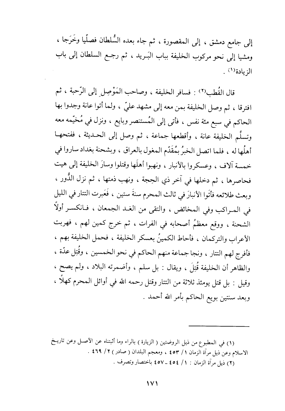 قَالَ القُطْب (2) : فَسَافر الخَلِيْفَة وَصَاحِبُ المَوْصِلِ إِلَى الرّحبَة، ثُمَّ افْترقَا، ثُمَّ وَصل الخَلِيْفَة بِمَنْ مَعَهُ إِلَى مشْهد عَلِيّ، وَلَمَّا أَتُوا عَانَة وَجَدُوا بِهَا الحَاكِم فِي سَبْع مائَة نَفْسٍ، فَأَتَى إِلَى المُسْتَنْصِر وَبَايع، وَنَزَلَ فِي مُخيَّمِه مَعَهُ، وَتَسَلَّمَ الخَلِيْفَة عَانَة، وَأَقطعهَا جَمَاعَةً، ثُمَّ وَصل إِلَى الحَدِيْثَة، فَفَتَحهَا أَهْلُهَا لَهُ، فَلَمَّا اتَّصل الخَبَرُ بِمقدمِ المَغُوْلِ بِالعِرَاقِ، وَبشحنَة بَغْدَاد سَارُوا فِي خَمْسَة آلاَف، وَعَسْكَرُوا بِالأَنْبَار، وَنَهبُوا أَهْلَهَا وَقتلُوا، وَسَارَ الخَلِيْفَة إِلَى هيت فَحَاصَرَهَا، ثُمَّ دخلهَا فِي آخِرِ ذِي الحِجَّةِ، وَنَهب ذِمَّتهَا، ثُمَّ نَزَلَ الدُّور، وَبَعَثَ طلاَئِعه، فَأَتَوُا الأَنْبَارَ فِي ثَالِثِ المُحَرَّمِ سنَةَ سِتِّينَ، فَعَبَرَتِ التَّتَارُ فِي اللَّيْلِ فِي المَرَاكِبِ وَفِي المَخَائِضِ، وَالتَقَى مِنَ الغَدِ الجَمْعَانِ، فَانْكَسَرَ أَوَّلاً الشِّحنَةُ، وَوَقَعَ مُعْظَمُ أَصْحَابِهِ فِي الفُرَاتِ، ثُمَّ خَرَجَ كَمِيْنٌ لَهُم، فَهَرَبَتِ الأَعرَابُ وَالتُّرُكْمَانُ، فَأَحَاطَ الكَمِيْنُ بِعَسْكَرِ الخَلِيْفَةِ، فَحَمَلَ الخَلِيْفَةُ بِهِم، فَأَفرجَ لَهُم التَّتَار، وَنَجَا جَمَاعَة مِنْهُم الحَاكِم فِي نَحْو الخَمْسِيْنَ، وَقُتِلَ عِدَّةٌ، وَالظَّاهِر أَنَّ الخَلِيْفَة قُتِلَ، وَيُقَالُ: بَلْ سَلِمَ، وَأَضمرته البِلاَد، وَلَمْ يَصِحَّ.