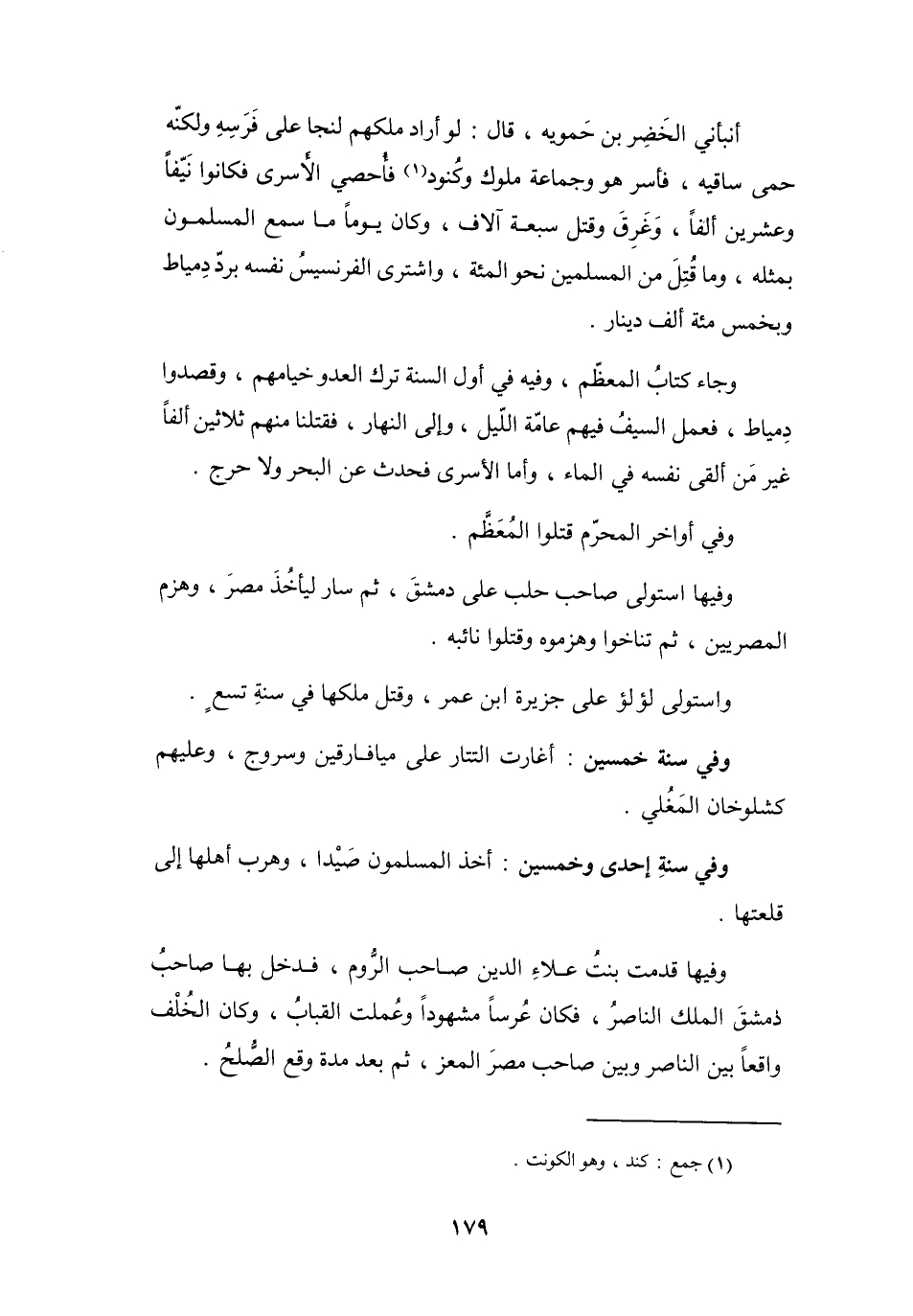 أَنْبَأَنِي الخَضِرُ بنُ حَمُّوَيْه، قَالَ: لَوْ أَرَادَ ملكهُم لنجَا عَلَى فَرَسِهِ وَلَكِنَّهُ حَمَى سَاقيه، فَأُسر هُوَ وَجَمَاعَة مُلُوْك وَكُنُوْد (1) ، فَأُحْصِي الأَسرَى فَكَانُوا نَيِّفاً وَعِشْرِيْنَ أَلْفاً، وَغَرِقَ وَقُتِلَ سَبْعَة آلاَف، وَكَانَ يَوْماً مَا سَمِعَ المُسْلِمُوْنَ بِمِثْلِهِ، وَمَا قُتِلَ مِنَ المُسْلِمِيْنَ نَحْو المائَة، وَاشْتَرَى الفرنسيسُ نَفْسه بِرَدِّ دِمْيَاط وَبِخَمْس مائَةِ أَلْفِ دِيْنَارٍ.