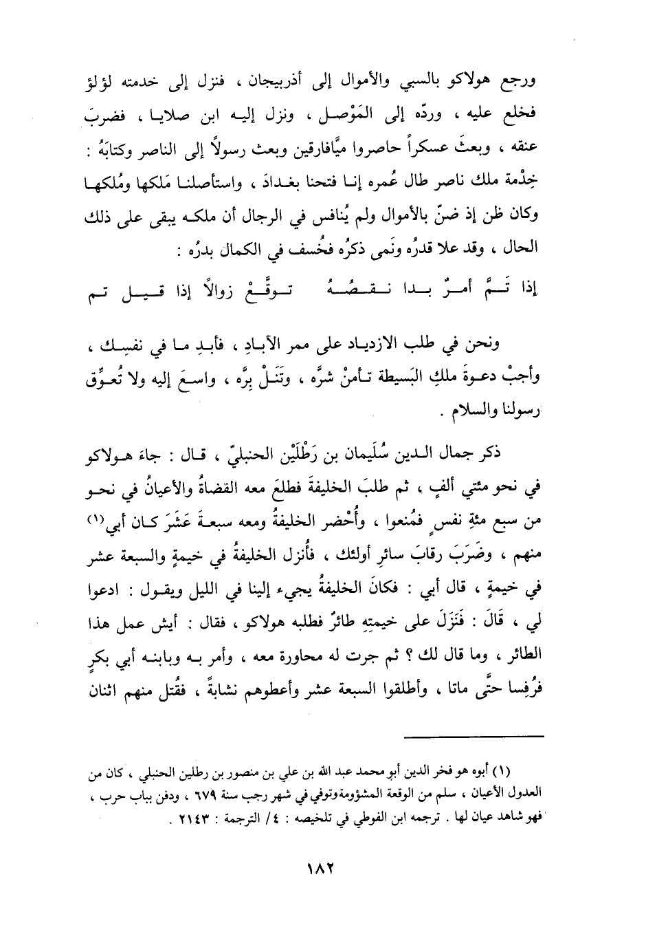 وَرجع هُوْلاَكُو بِالسَّبْيِ وَالأَمْوَال إِلَى أَذْرَبِيْجَانَ، فَنَزَلَ إِلَى خِدْمَتِه لُؤْلُؤٌ، فَخلعَ عَلَيْهِ، وَردَّه إِلَى المَوْصِلِ، وَنَزَلَ إِلَيْهِ ابْنُ صلاَيَا، فَضَرَبَ عُنُقَه، وَبَعَثَ عَسْكَراً حَاصرُوا مَيَّافَارِقِيْنَ، وَبَعَثَ رَسُوْلاً إِلَى النَّاصِرِ وَكِتَابُه: خِدْمَة ملك نَاصِر طَالَ عُمُرُهُ إِنَّا فَتحنَا بَغْدَادَ، وَاسْتَأْصلنَا مَلِكَهَا وَمُلْكَهَا، وَكَانَ ظَنَّ إِذْ ضنَّ بِالأَمْوَالِ وَلَمْ يُنَافس فِي الرِّجَالِ أَن ملكه يَبْقَى عَلَى ذَلِكَ الحَال، وَقَدْ علاَ قدرُه وَنَمَى ذِكْرُهُ، فَخُسف فِي الكَمَال بَدرُه: