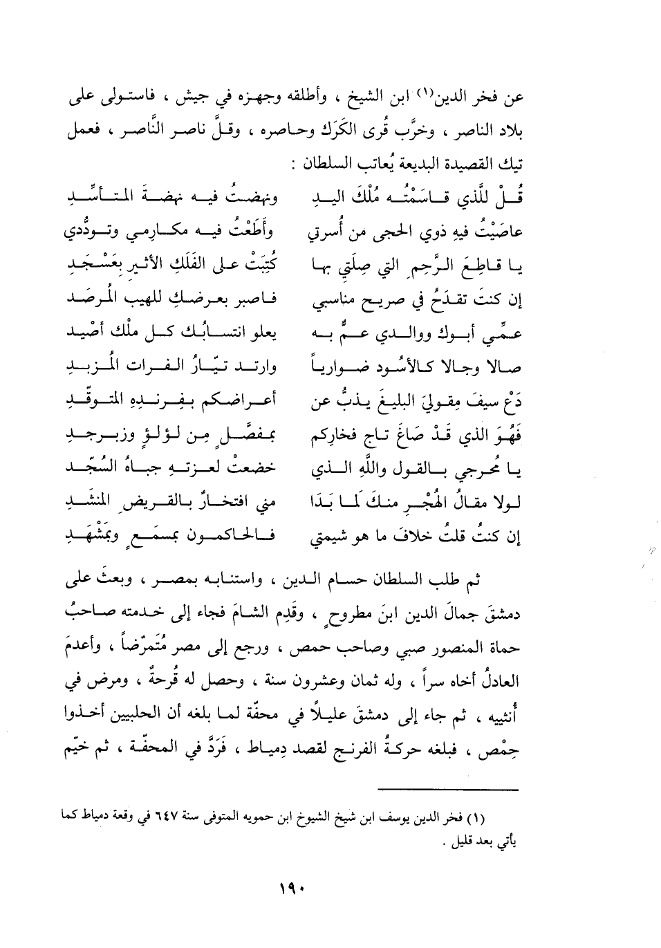 عَنْ فَخْرِ الدِّيْنِ (1) ابْنِ الشَّيْخِ، وَأَطلَقَه، وَجَهَّزَه فِي جَيْشٍ، فَاسْتولَى عَلَى بِلاَدِ النَّاصِرِ، وَخَرَّبَ قُرَى الكَرَكِ، وَحَاصَرَه، وَقَلَّ نَاصِرُ النَّاصِرِ، فَعَمِلَ تِيْكَ القَصيدَةَ البَدِيْعَةَ يُعَاتِبُ السُّلْطَانَ:
