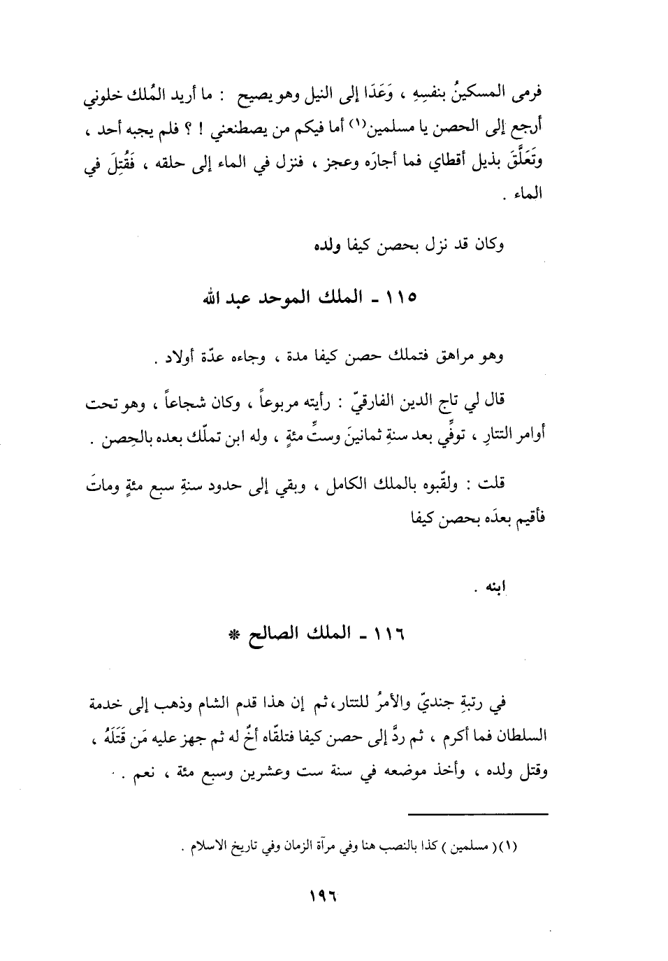 فِي رُتْبَةِ جُندِيٍّ وَالأَمْرُ لِلتَّتَارِ، ثُمَّ إِنَّ هَذَا قَدِمَ الشَّامَ، وَذَهَبَ إِلَى خدمَةِ السُّلْطَانِ، فَمَا أُكرِمَ، ثُمَّ ردَّ إِلَى حِصنِ كَيْفَا، فَتلقَّاهُ أَخٌ لَهُ، ثُمَّ جَهَّزَ عَلَيْهِ مَنْ قَتَلَه، وَقُتِلَ وَلدُه، وَأَخَذَ مَوْضِعَه فِي سَنَةِ سِتٍّ وَعِشْرِيْنَ وَسَبْعِ مائَةٍ، نَعم.