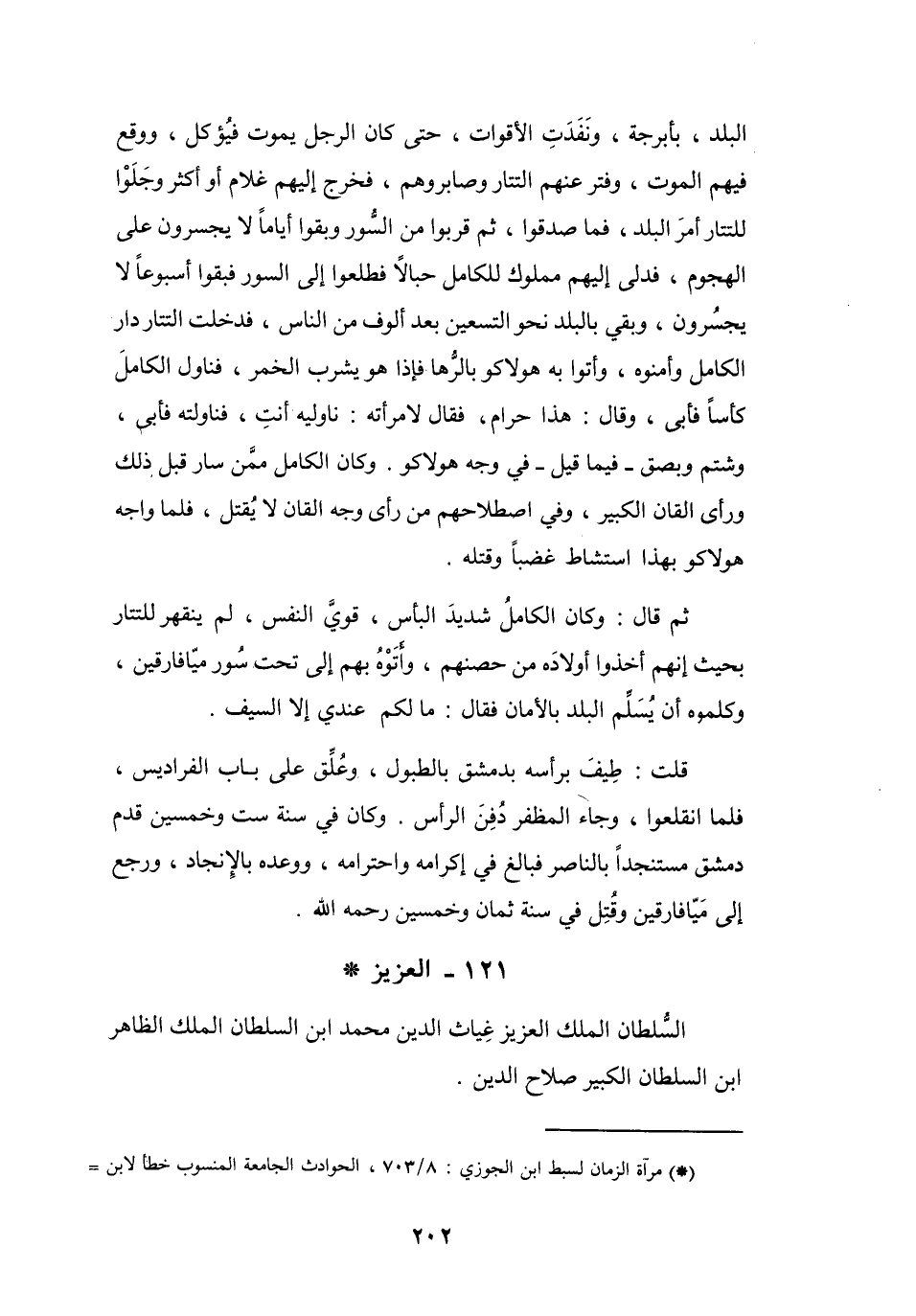 البَلَد، بِأَبرجَة، وَنَفَدَتِ الأَقوَات، حَتَّى كَانَ الرَّجُلُ يَموت فَيُؤكل، وَوَقَعَ فِيهِمُ المَوْتُ، وَفتر عَنْهُم التَّتَارُ وَصَابَرُوهُم، فَخَرَجَ إِلَيْهِم غُلاَم أَوْ أَكْثَر وَجَلَوْا لِلتَّتَارِ أَمرَ البَلَدِ، فَمَا صَدَقُوا، ثُمَّ قَربُوا مِنْ السُّورِ وَبَقوا أَيَّاماً لاَ يَجسرُوْنَ عَلَى الْهُجُوم، فَدلَى إِلَيْهِم مَمْلُوْك لِلْكَامِل حِبالاً، فَطَلعُوا إِلَى السُّوْرِ، فَبَقُوا أُسبوعاً لاَ يَجسرُوْنَ، وَبَقِيَ بِالبَلَدِ نَحْوُ التِّسْعِيْنَ بَعْد أُلوف مِنَ النَّاسِ، فَدَخَلتِ التَّتَارُ دَارَ الكَامِل وَأَمَّنوهُ، وَأَتَوا بِهِ هُولاَكو بِالرُّهَا، فَإِذَا هُوَ يَشرب الخَمْر، فَنَاول الكَامِلَ كَأْساً فَأَبَى، وَقَالَ: هَذَا حَرَامٌ.