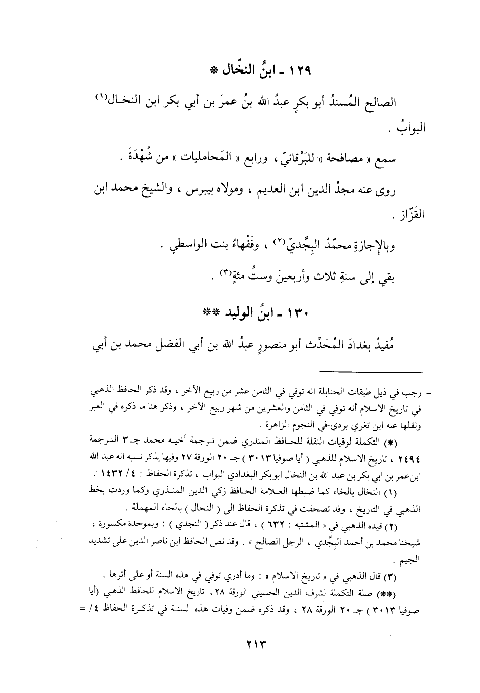 (1) النخال بالخاء كما ضبطها العلامة الحافظ زكي الدين المنذري وكما وردت بخط الذهبي في التاريخ، وقد تصحفت في تذكرة الحفاظ إلى (النحال) بالحاء المهملة.