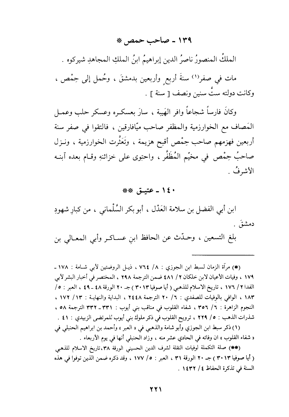 (*) مرآة الزمان لسبط ابن الجوزي: 8 / 764، ذيل الروضتين لأبي شامة: 178 - 179، وفيات الأعيان لابن خلكان 2 / 481 ضمن الترجمة 298، المختصر في أخبار البشر لأبي الفدا 2 / 176، تاريخ الإسلام للذهبي (أيا صوفيا 3013) ج 20 الورقة 48 - 49، العبر: 5 / 183، الوافي بالوفيات للصفدي: 6 / 20 الترجمة 2448، البداية والنهاية: 13 / 172، النجوم الزاهرة: 6 / 356، شفاء القلوب في مناقب بني أيوب: 331 - 332 الترجمة 58، شذرات الذهب: 5 / 229، ترويح القلوب في ذكر ملوك بني أيوب للمرتضى الزبيدي: 41.