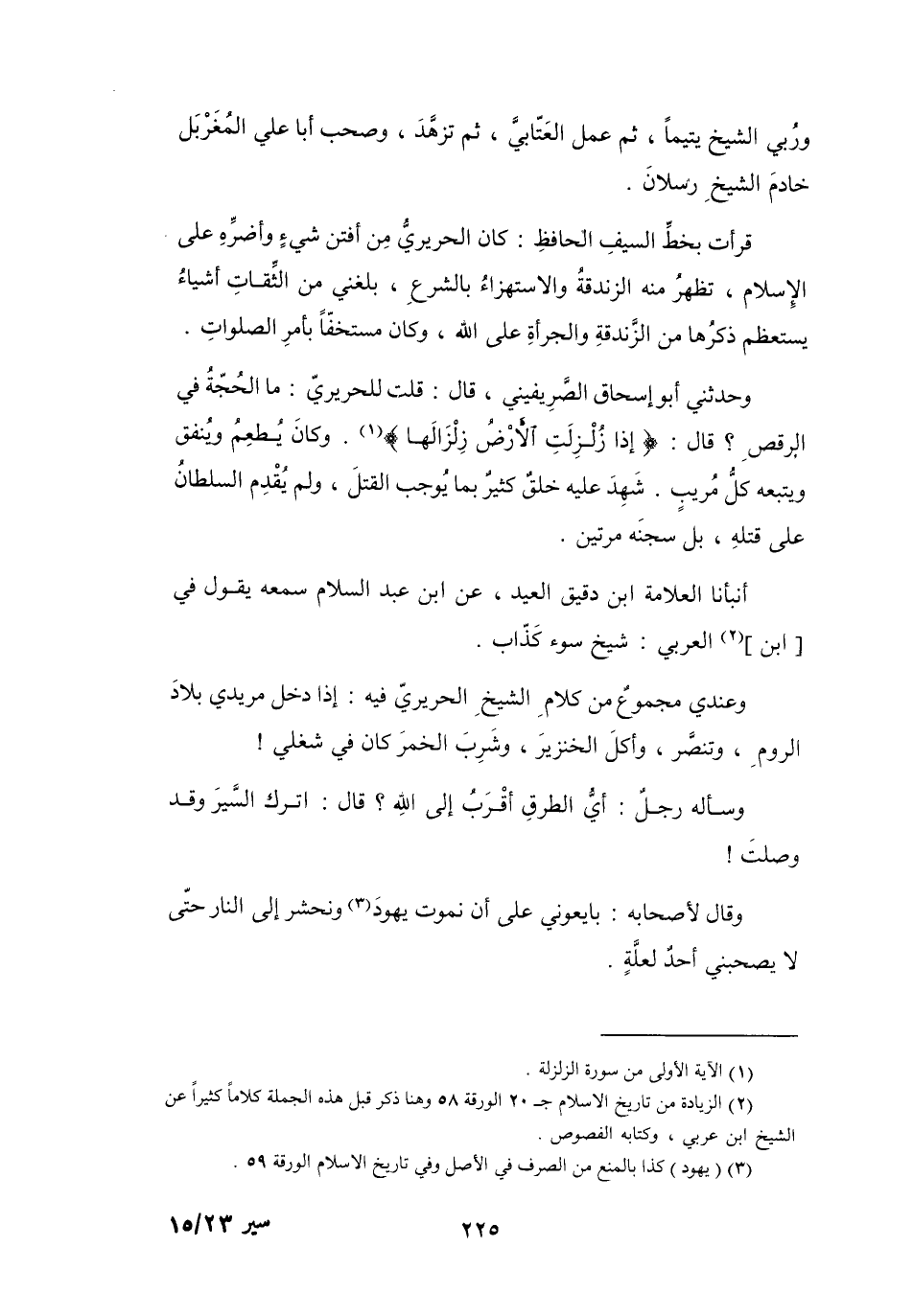 (2) الزيادة من تاريخ الإسلام ج 20 الورقة 58 وهنا ذكر قبل هذه الجملة كلاما كثيرا عن الشيخ ابن عربي، وكتابه الفصوص.