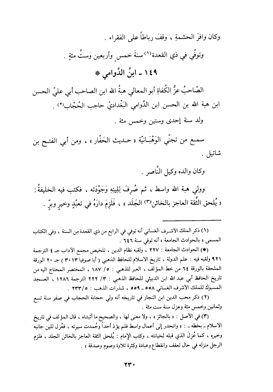149 - ابْنُ الدَّوَامِيِّ هِبَةُ اللهِ بنُ الحَسَنِ بنِ هِبَةِ اللهِ البَغْدَادِيُّ *