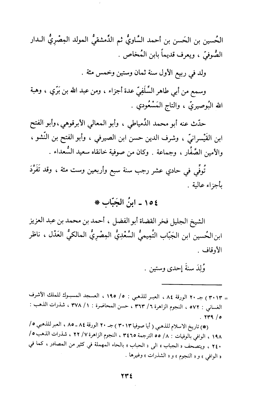 (*) تاريخ الإسلام للذهبي (أيا صوفيا 3013) ج 20 الورقة 84 - 85، العبر للذهبي 5 / 198، الوافي بالوفيات: 8 / 55 الترجمة 3465، النجوم الزاهرة 7 / 22، شذرات الذهب 5 / 240، ويتصحف " الجباب " إلى " الحباب " بالحاء المهملة في كثير من المصادر، كما في " الوافي " و" النجوم " و" الشذرات " وغيرها.