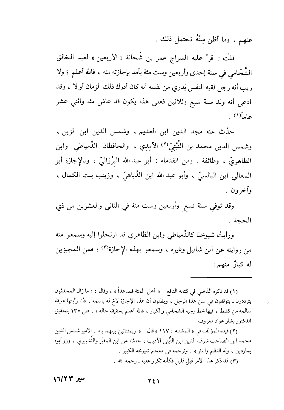 (1) قد ذكره الذهبي في كتابه النافع: " أهل المئة فصاعدا "، وقال: " ما زال المحدثون يترددون - يتوقفون في سن هذا الرجل، ويظنون أن هذه الاجازة لأخ له باسمه، فأنا رأيتها عتيقة سالمة من كشط، فيها خط وجيه الشحامي والكبار، فالله أعلم بحقيقة حاله ". ص 137 بتحقيق الدكتور بشار عواد معروف.